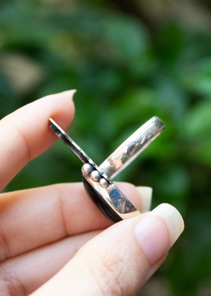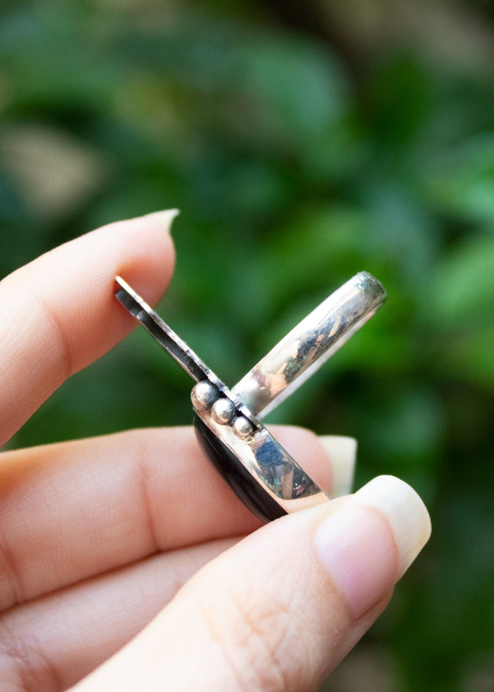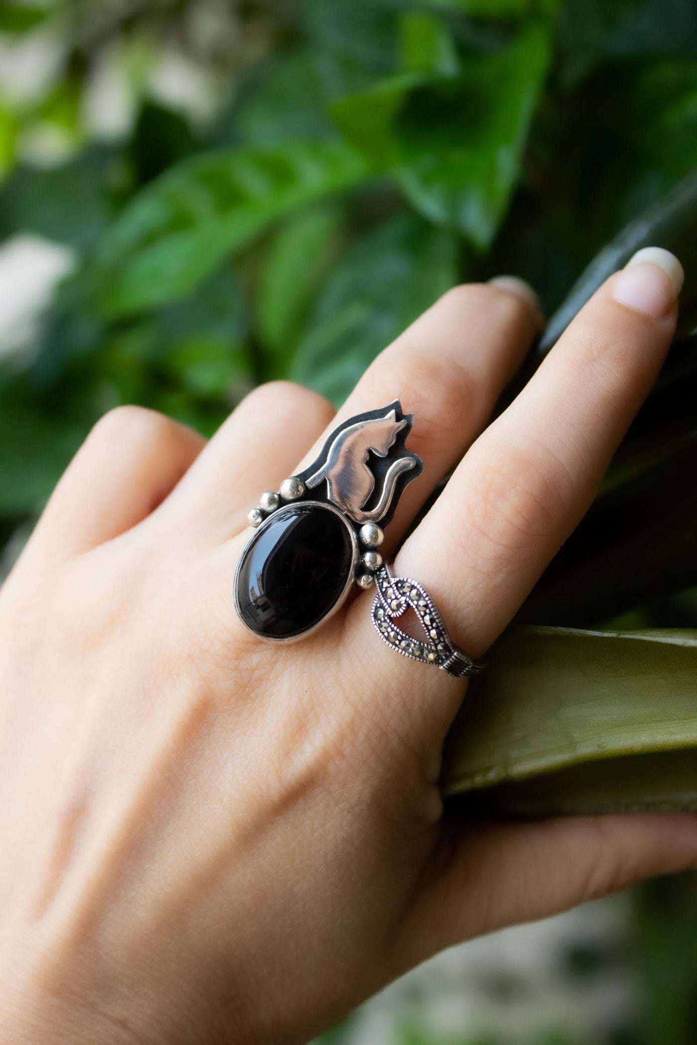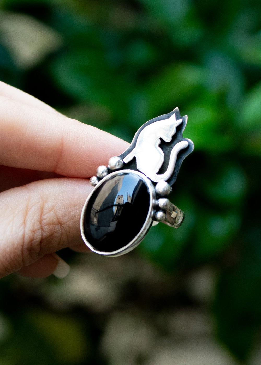 A sleek oval black onyx, set beneath the silhouette of a poised cat, radiates strength and mystery. Crafted in sterling silver with fine detailing, this ring captures the essence of intuition and quiet power.