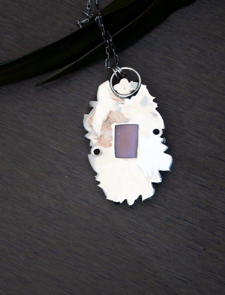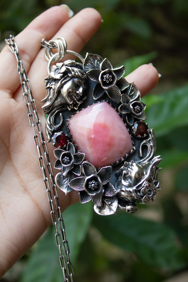 A soft pink opal, glowing with gentle warmth, is framed by sculpted silver blossoms and vines. Garnet accents add a rich crimson spark, creating a piece that feels both tender and powerful — a celebration of femininity and earth’s quiet strength.