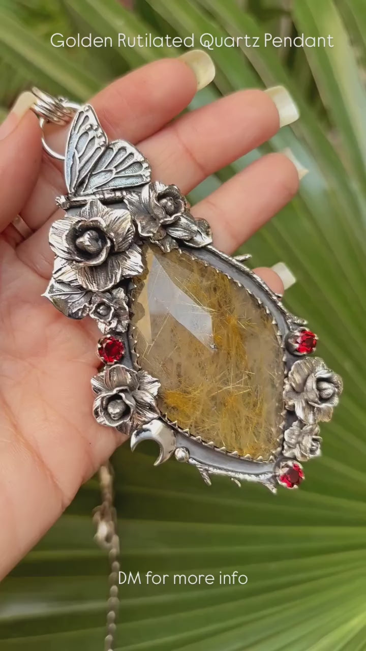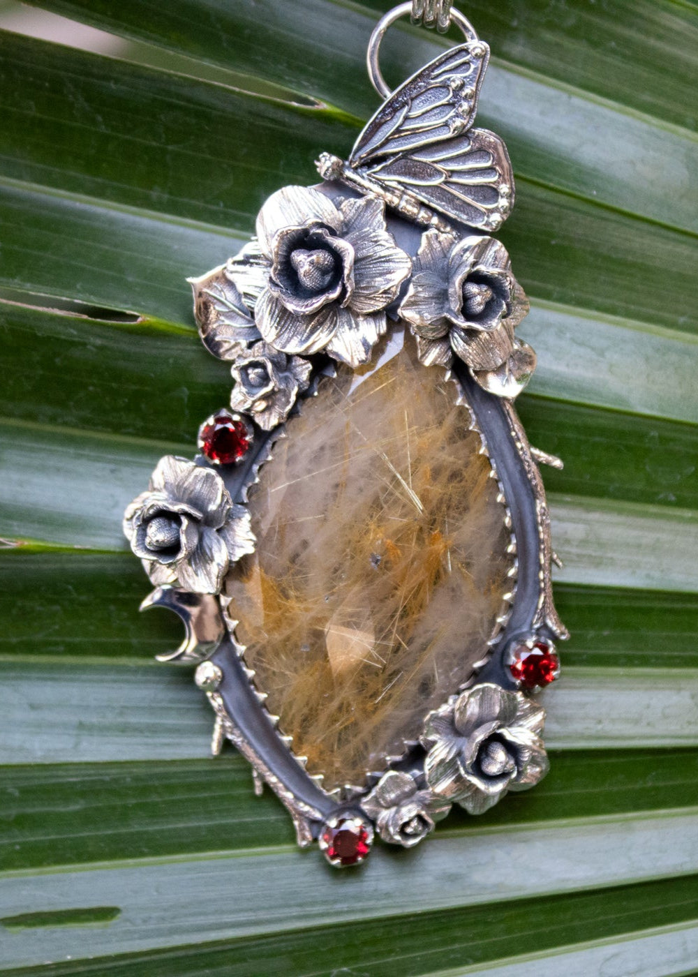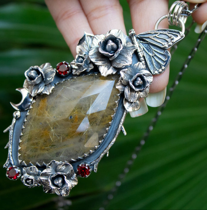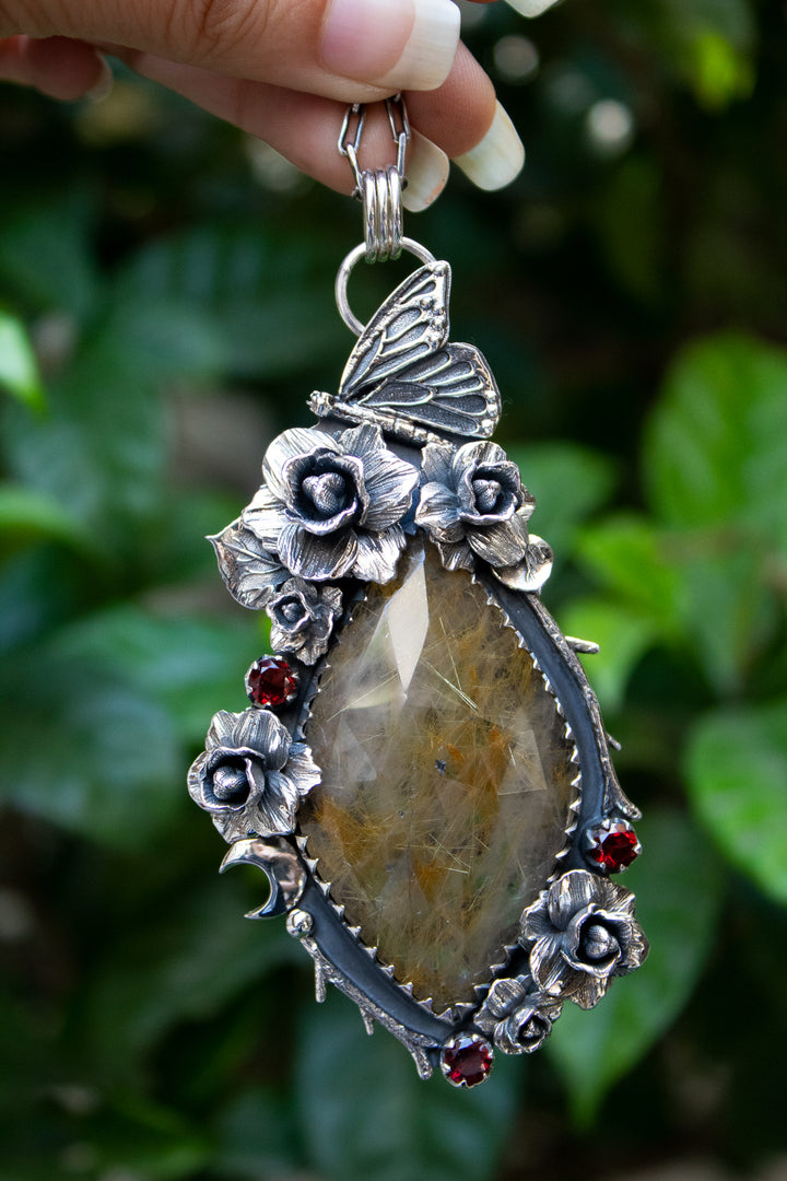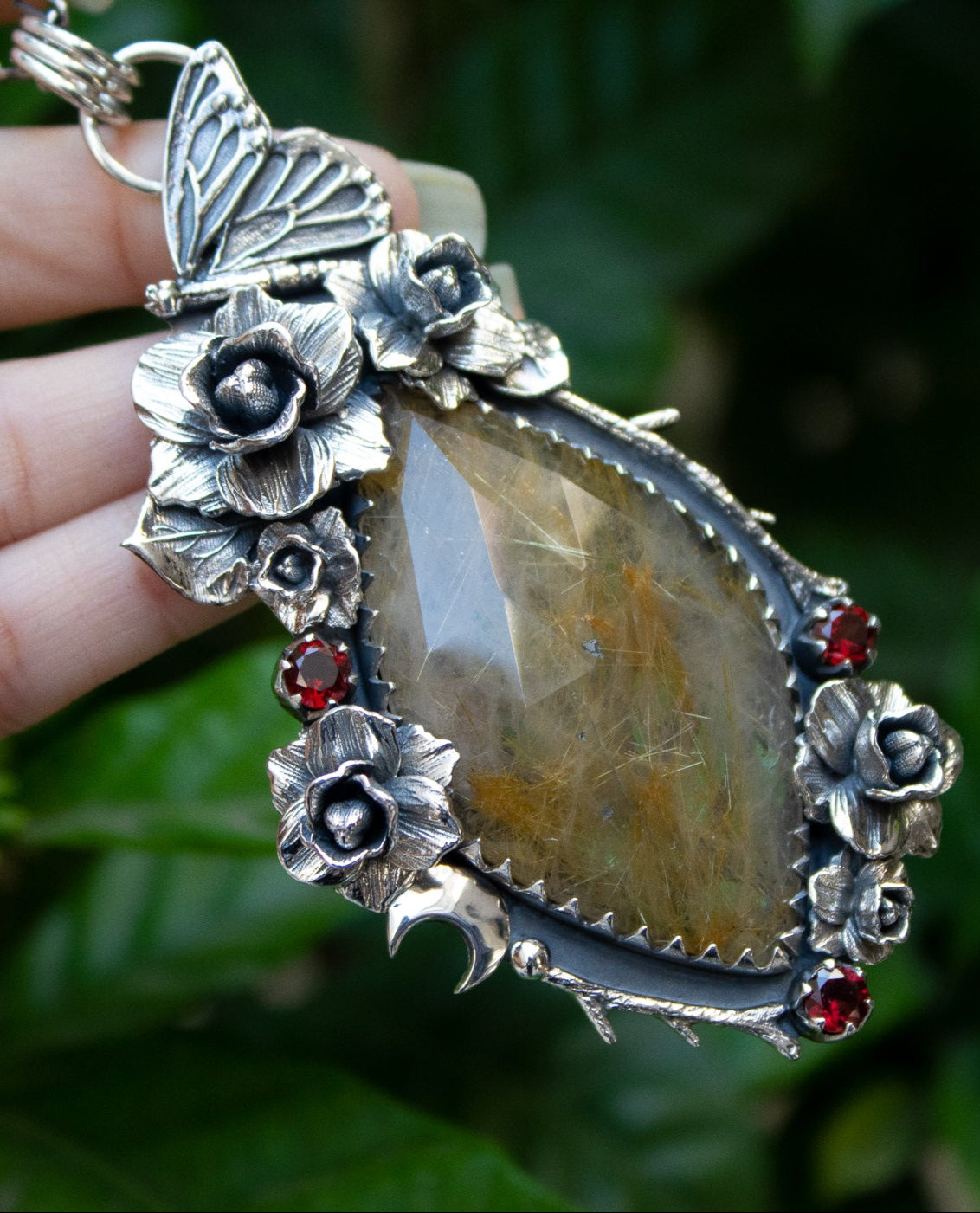 A faceted golden rutilated quartz glows with natural golden threads, set in an ornate sterling silver frame of blooming roses and crescent moons. Accented with deep red garnets and crowned with a butterfly, this pendant embodies transformation, vitality, and beauty.