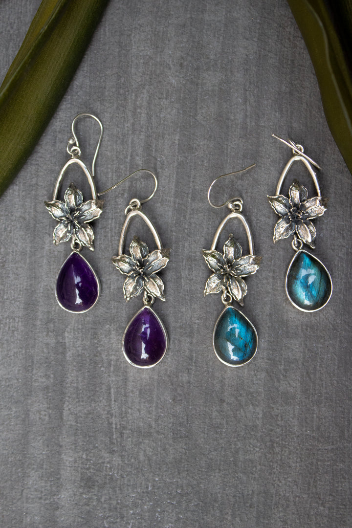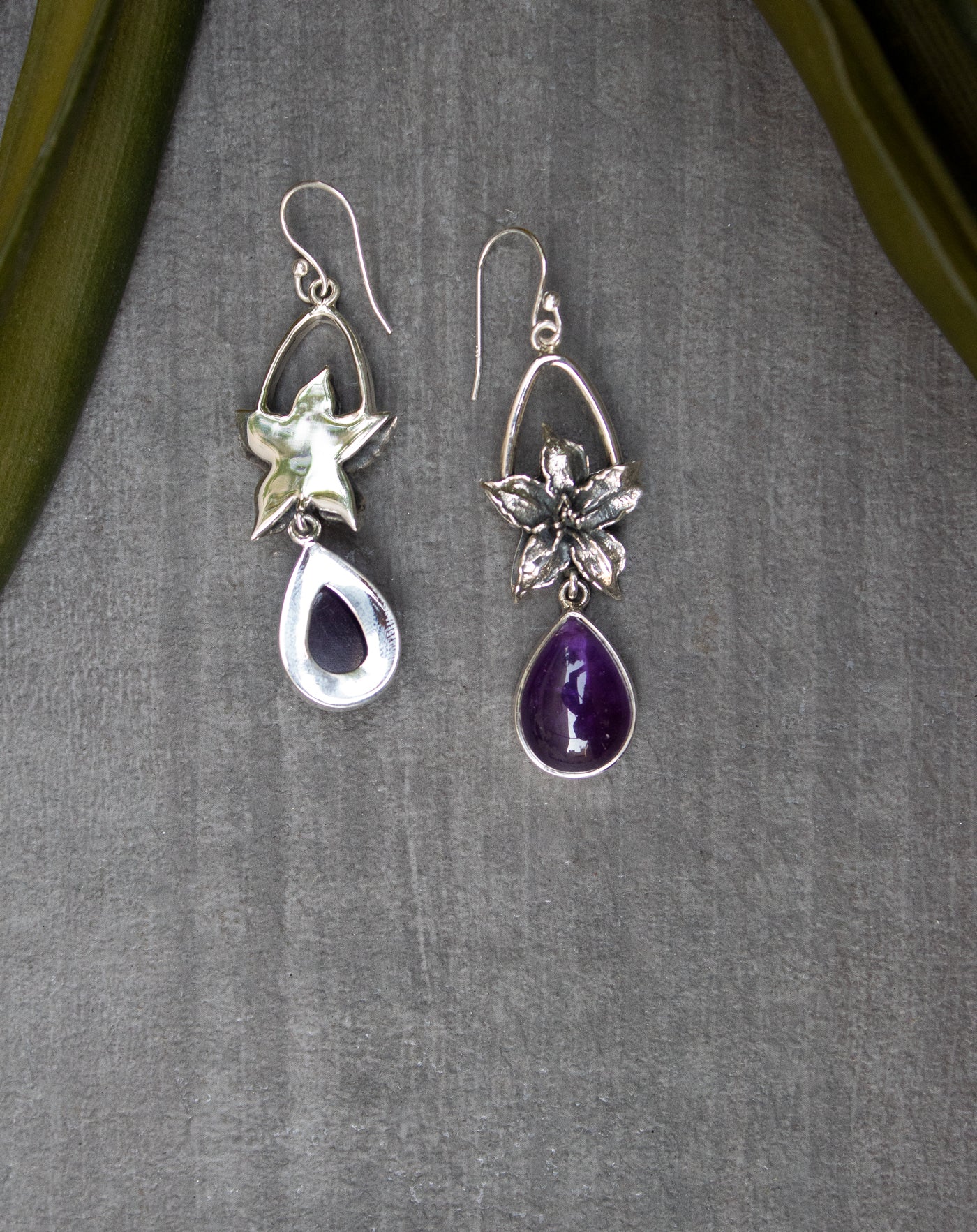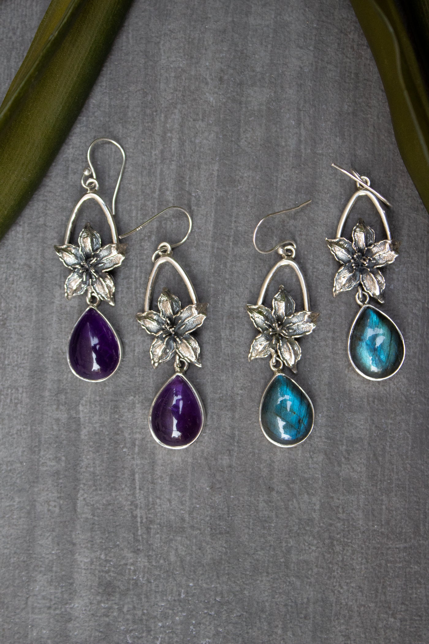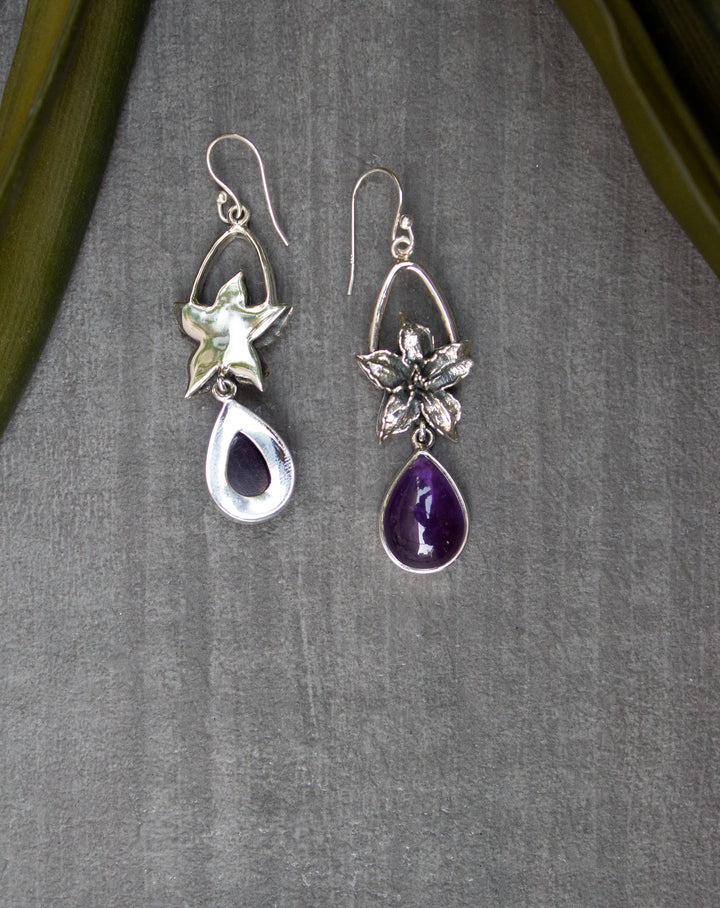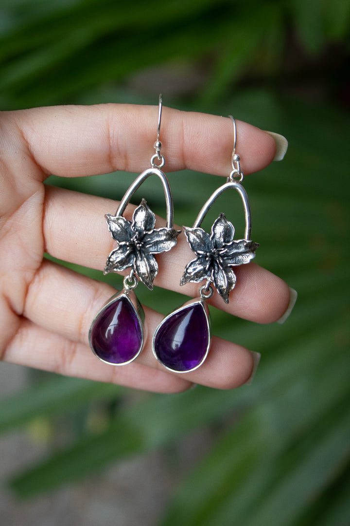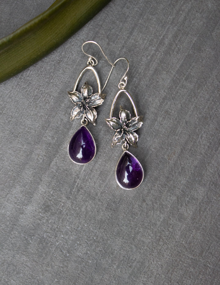 A cascade of sterling silver blossoms holds glowing amethyst teardrops, radiating mystical charm. These earrings shimmer with a quiet elegance, perfect for dreamers seeking balance, beauty, and inner strength.