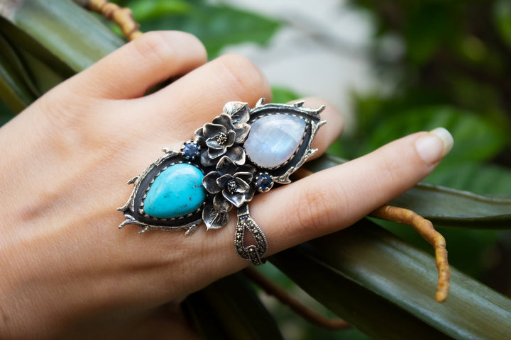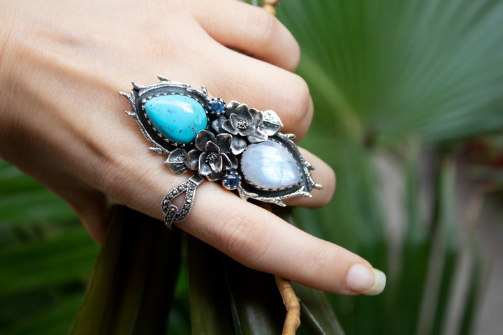 Two powerful gemstones meet in one striking design — the dreamy glow of rainbow moonstone paired with the tranquil blue of turquoise, embraced by blossoming sterling silver flowers and leaves. This bold yet feminine statement ring symbolizes unity, balance, and divine protection.