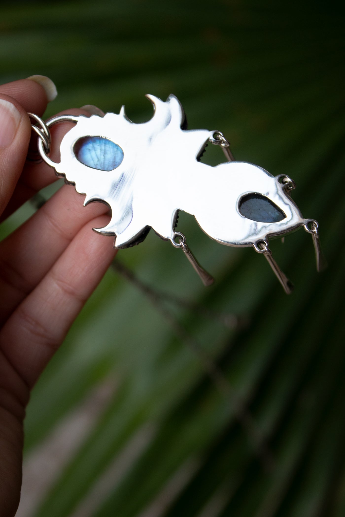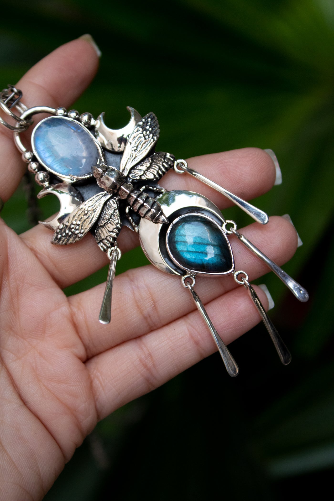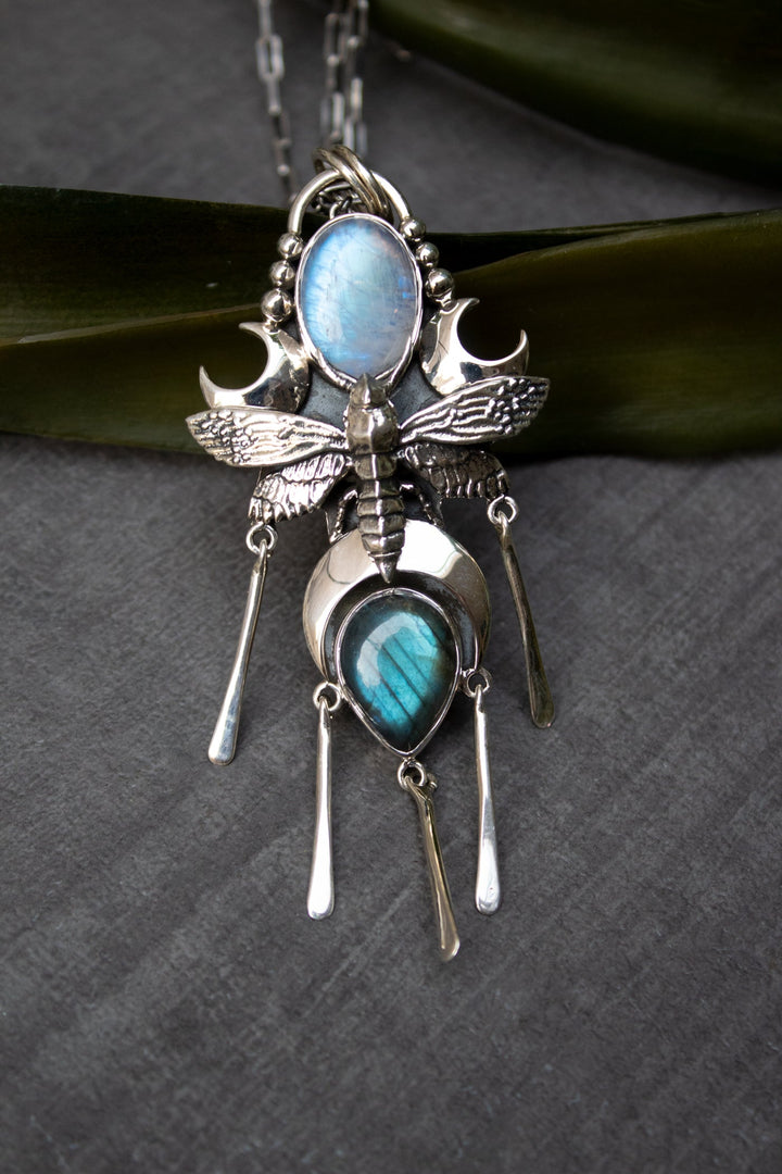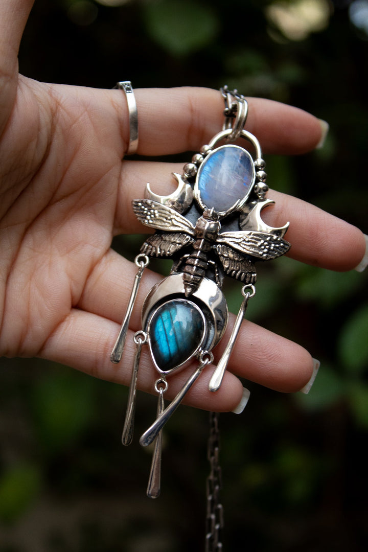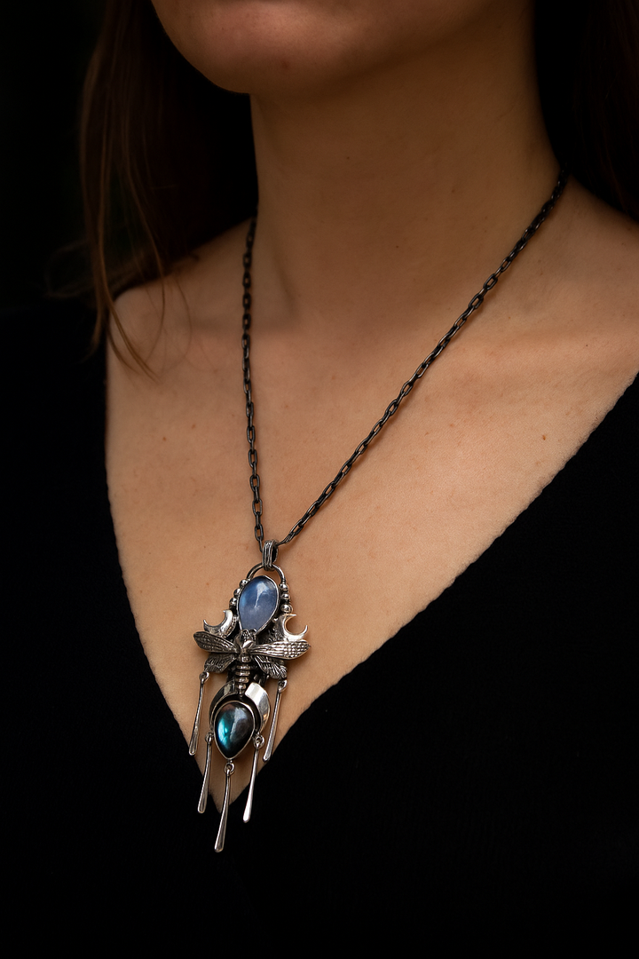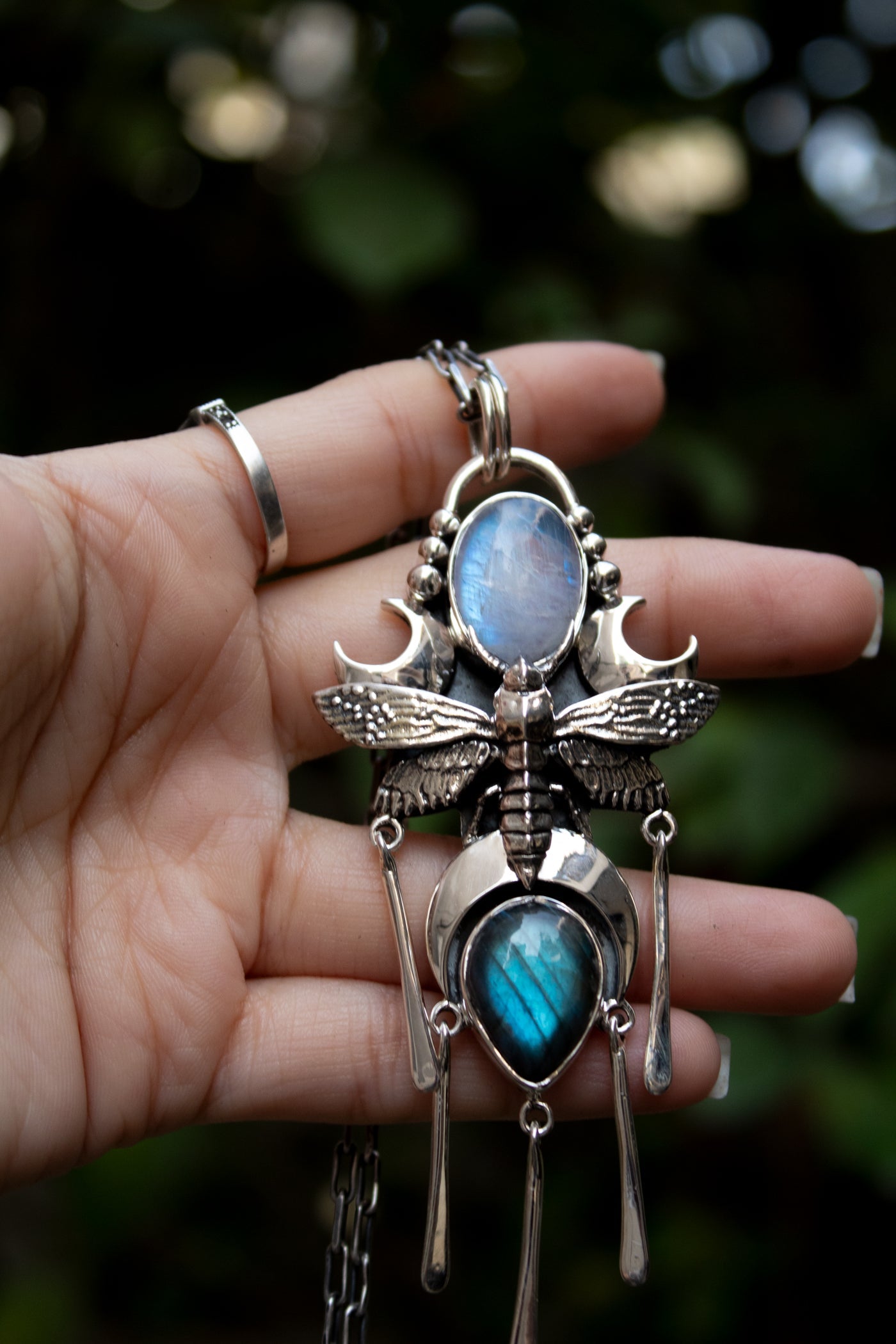 A striking union of moonstone and labradorite set in sterling silver, crowned with a detailed scarab motif and framed by lunar crescents. Dangling silver droplets add movement and mystique, making this pendant a talisman of hidden power and cosmic transformation.