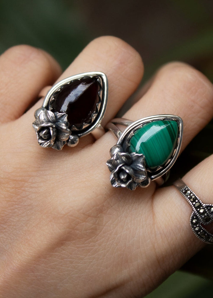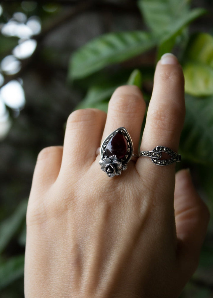 A teardrop-cut garnet glows with deep crimson fire, cradled in sterling silver and