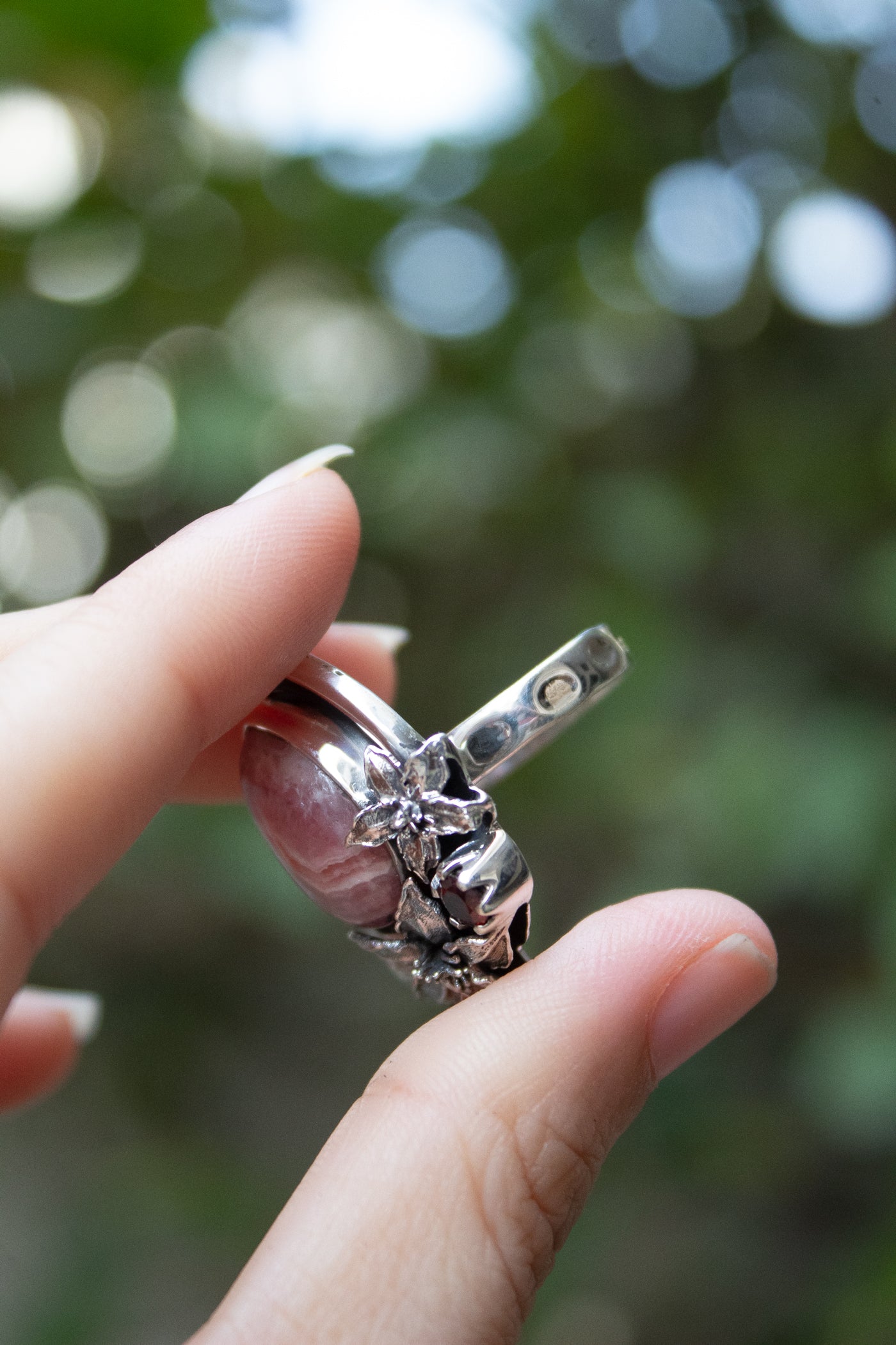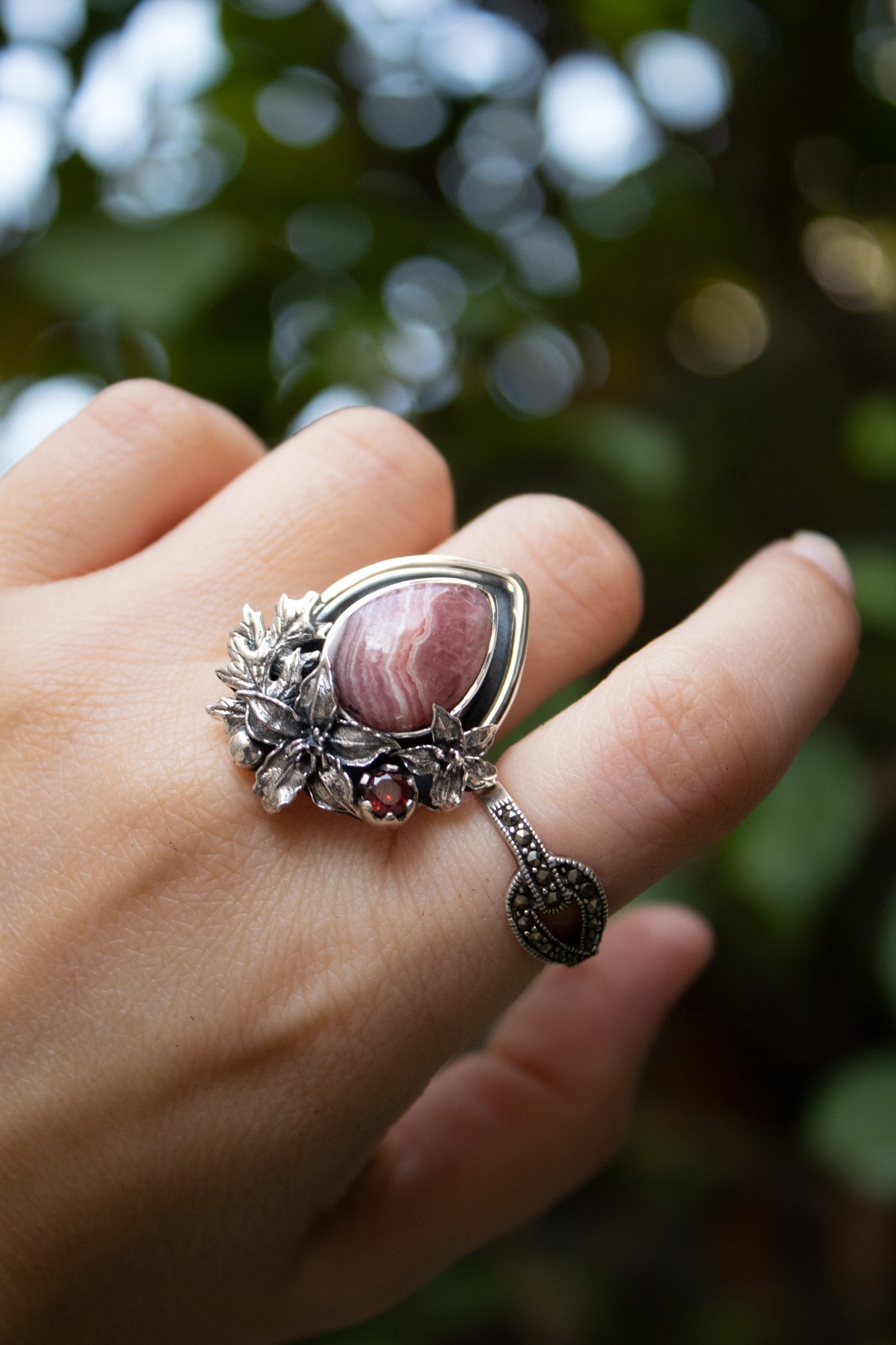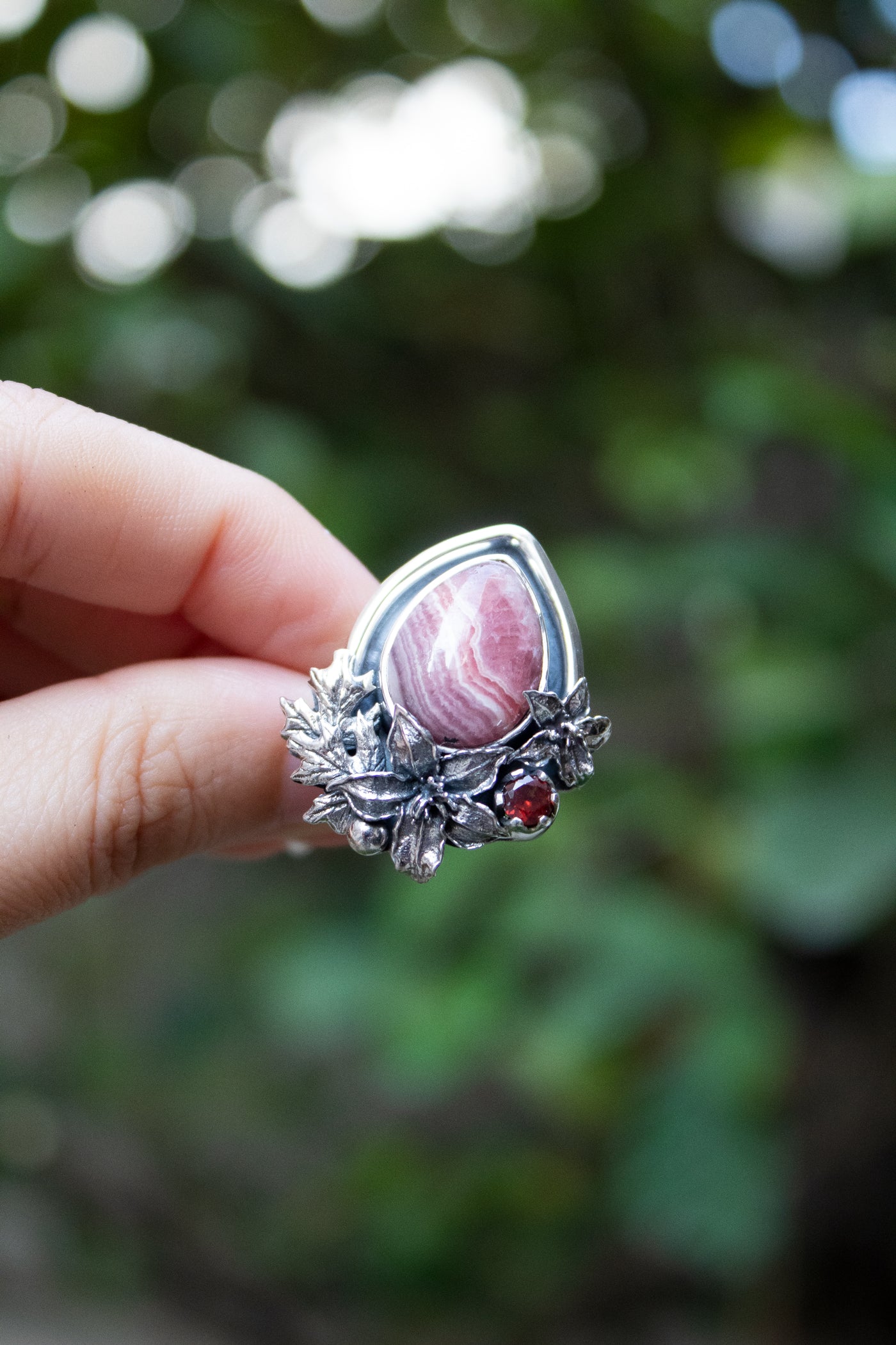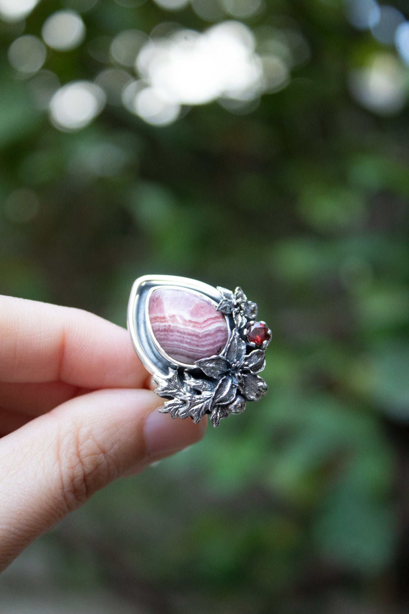 A vivid pink rhodochrosite cabochon rests in sterling silver, framed by delicate blossoms and accented with a fiery garnet. This piece channels both tenderness and strength, embodying the heart’s resilience while blooming with nature’s grace.