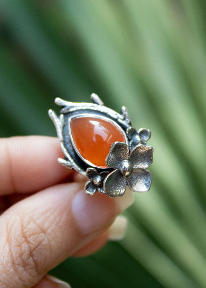 A radiant teardrop carnelian glows with fiery warmth, cradled in a sterling silver setting of blossoming flowers and branch-like prongs. This ring embodies passion and vitality, a reminder of your inner flame and the courage it sparks.