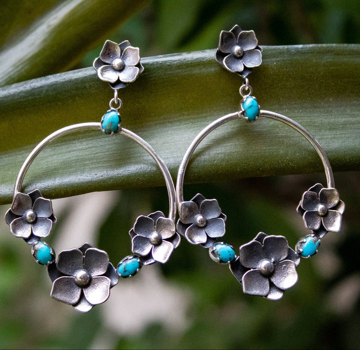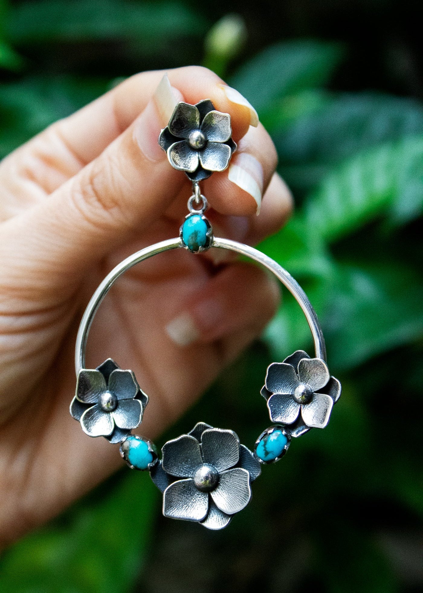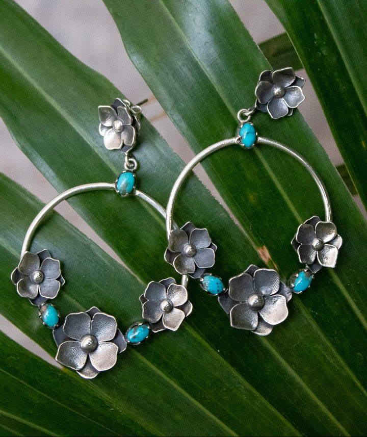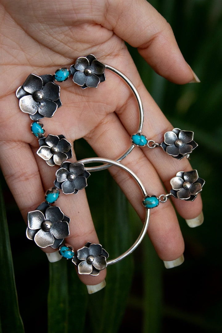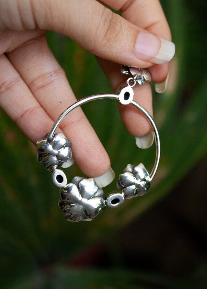 A pair of bold sterling silver hoops, blossoming with sculpted flowers and dotted