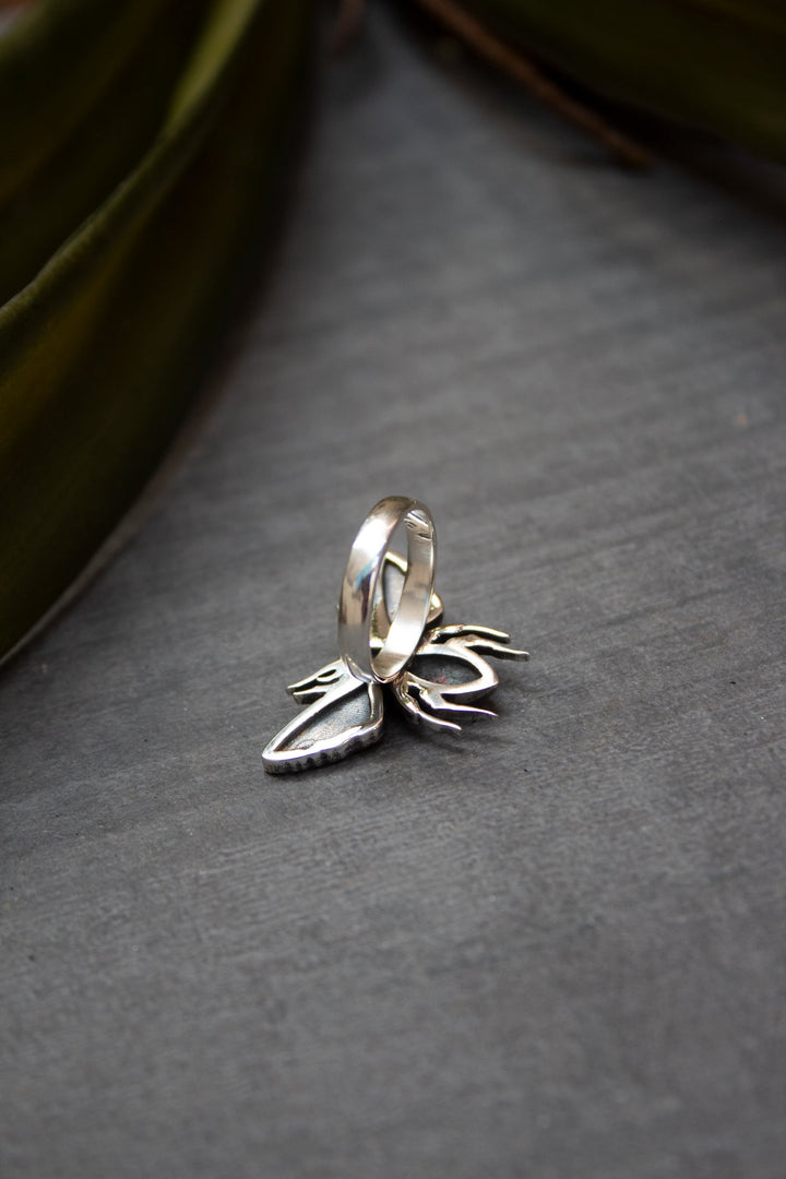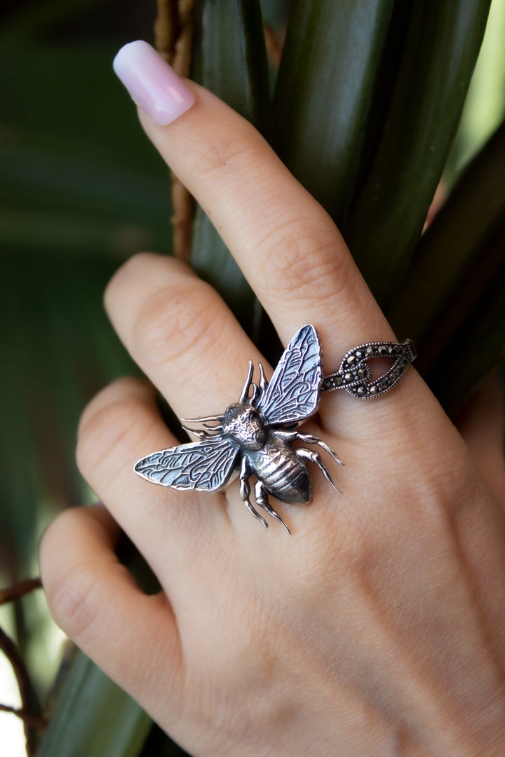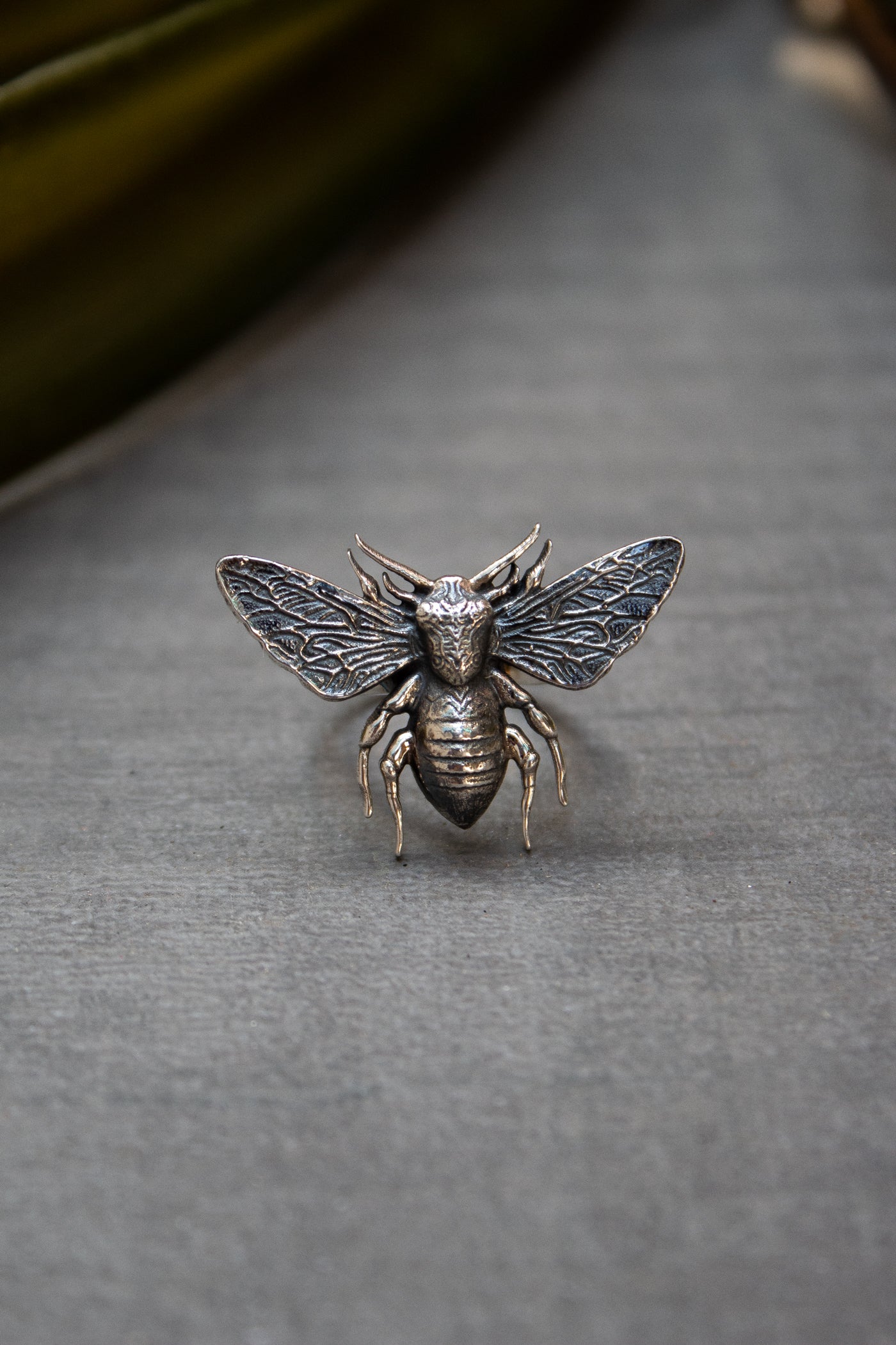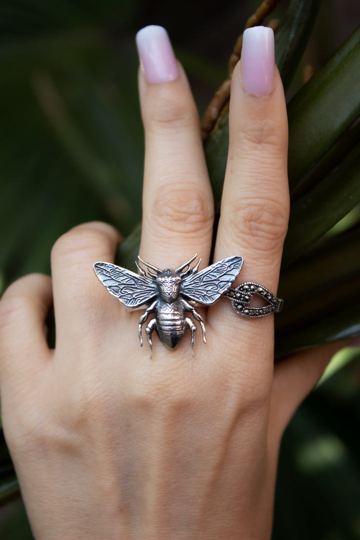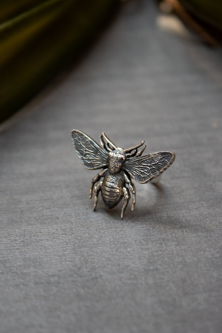 A bold sterling silver statement ring, featuring a finely detailed bee with textured wings that seem ready to take flight. Symbolizing protection, resilience, and the sweetness of life, this piece carries the wild spirit of the hive and the strength of transformation.