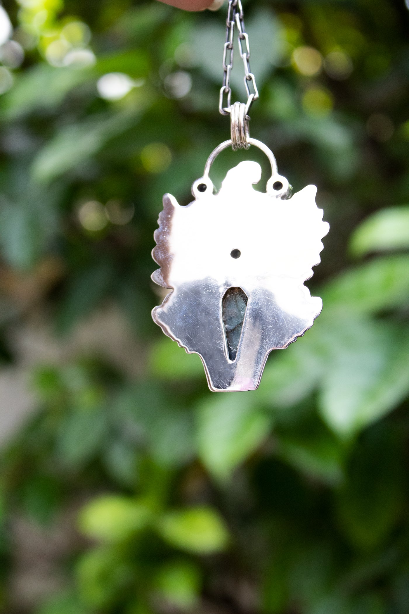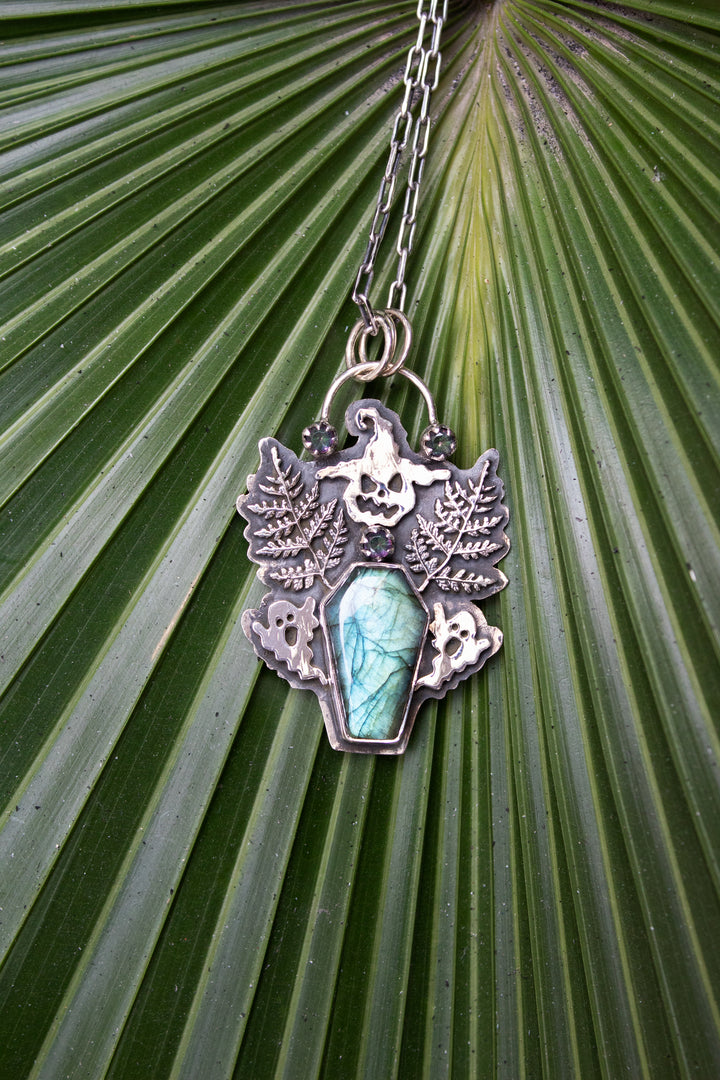 Handcrafted in sterling silver, this pendant features a glowing labradorite stone framed by ferns, tiny ghosts, and a witch’s hat. Radiating shades of blue and green, labradorite is known as a stone of magic and transformation. A talisman for those who walk between worlds, it embodies forest mystery and protective energy in one enchanted piece.