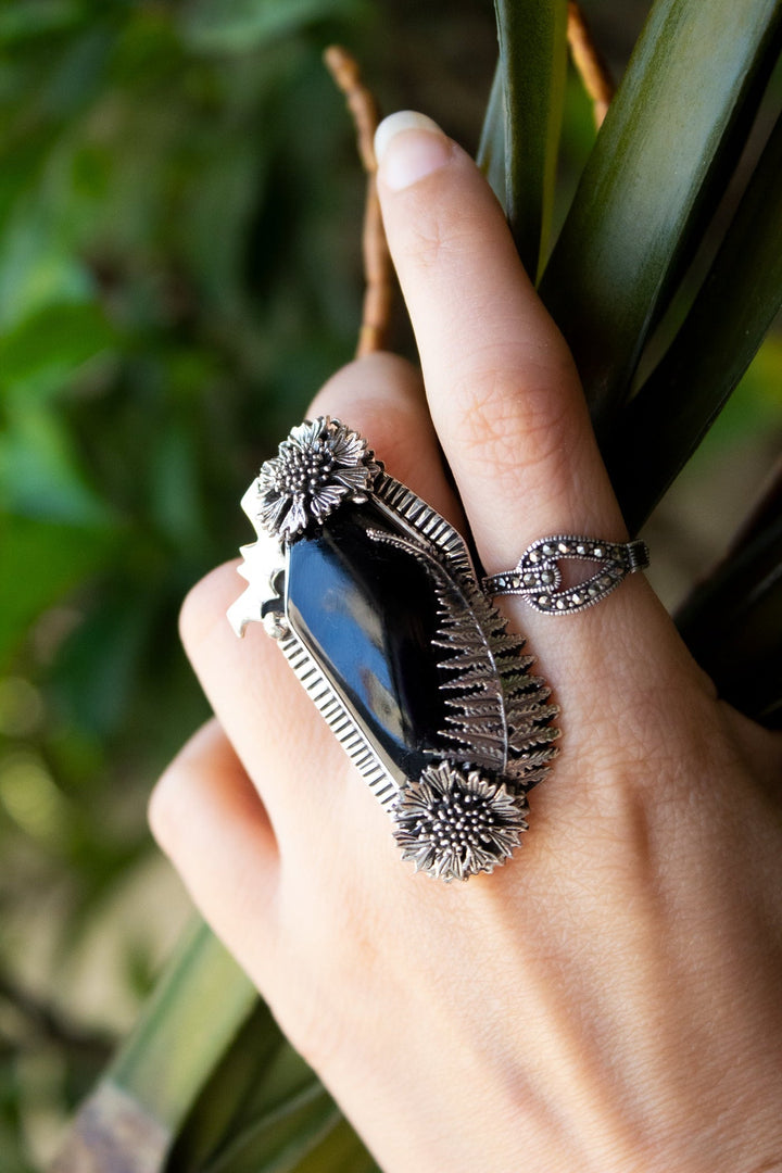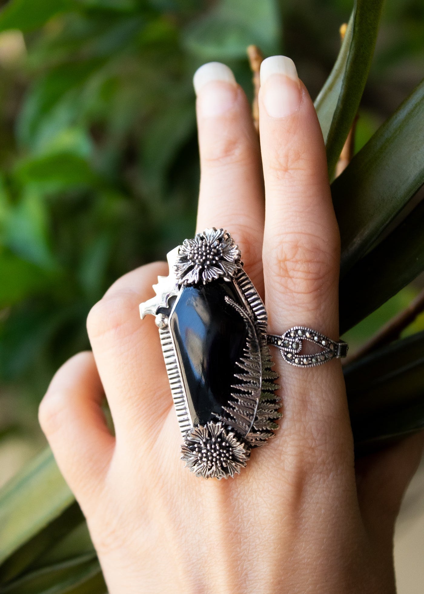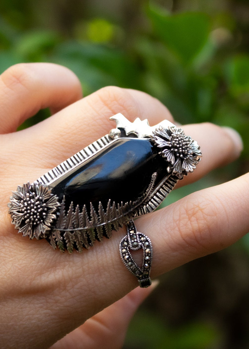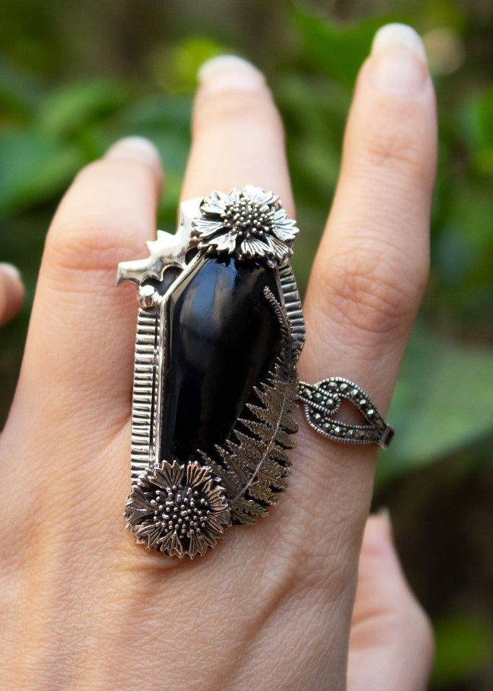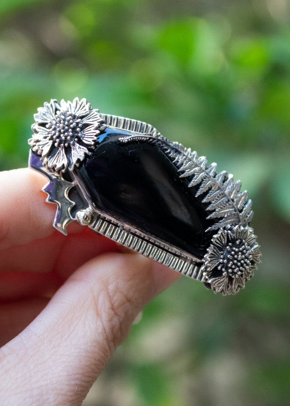 A bold, gothic statement ring crafted in sterling silver, featuring a polished coffin-