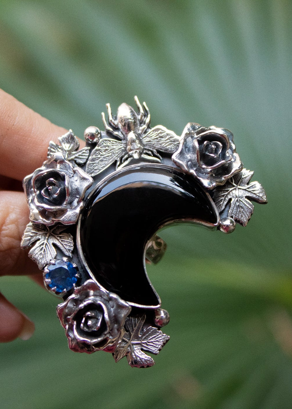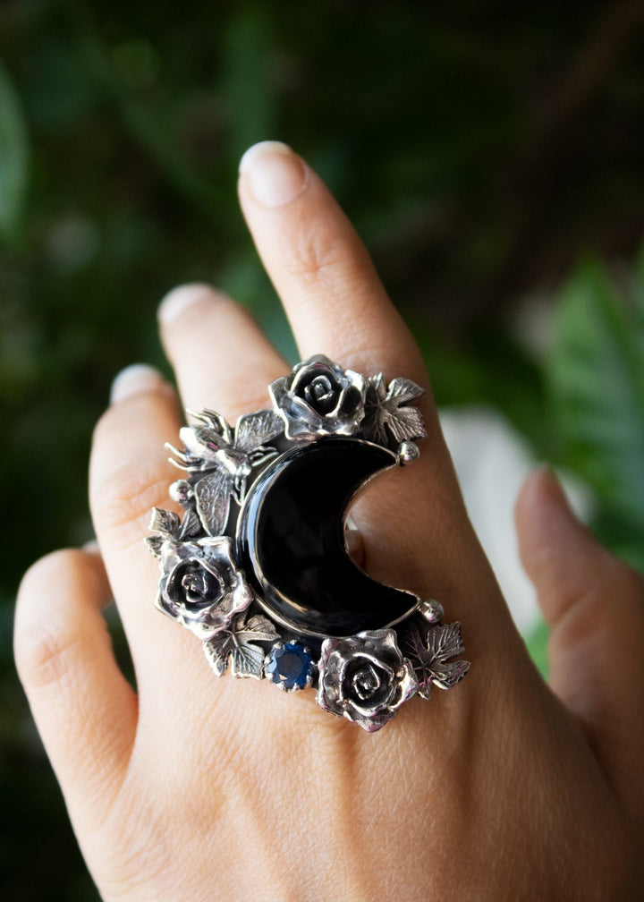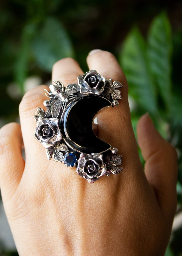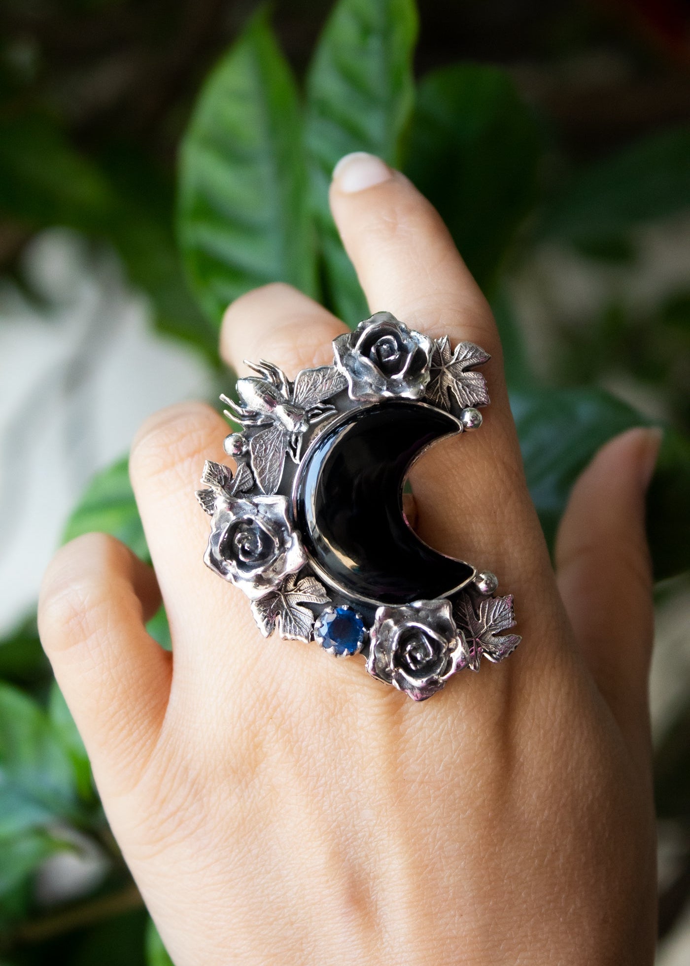 A bold crescent of polished black onyx rests at the heart of this sterling silver ring,