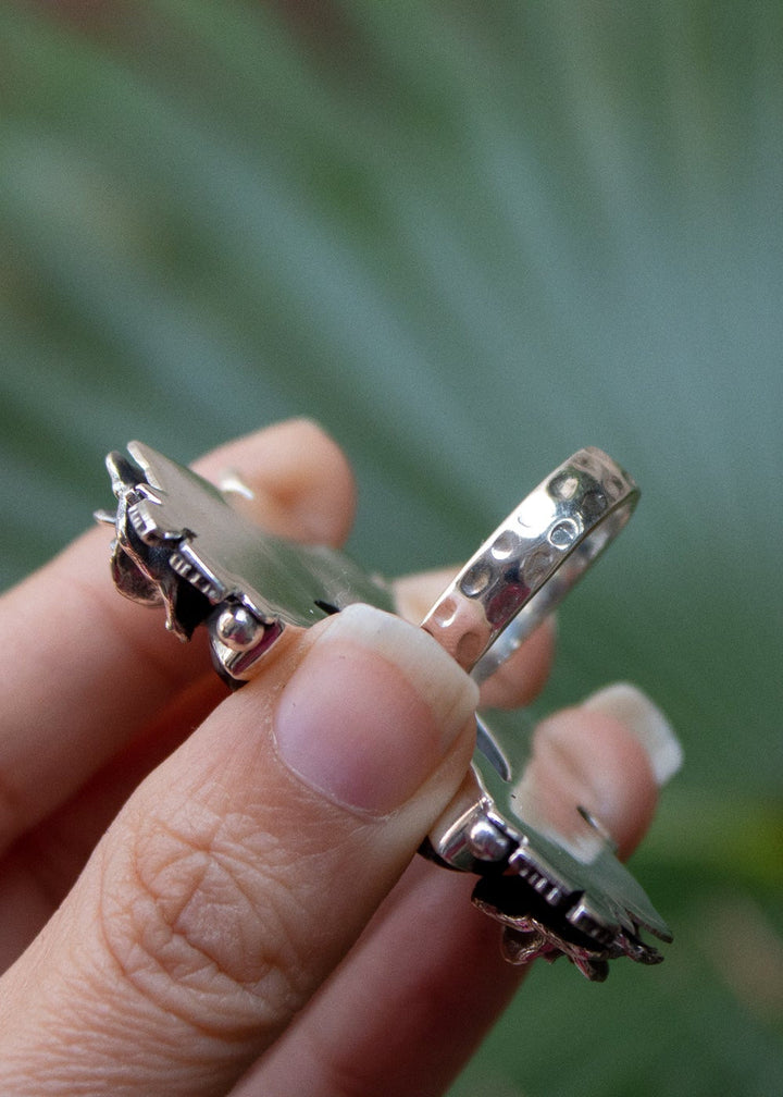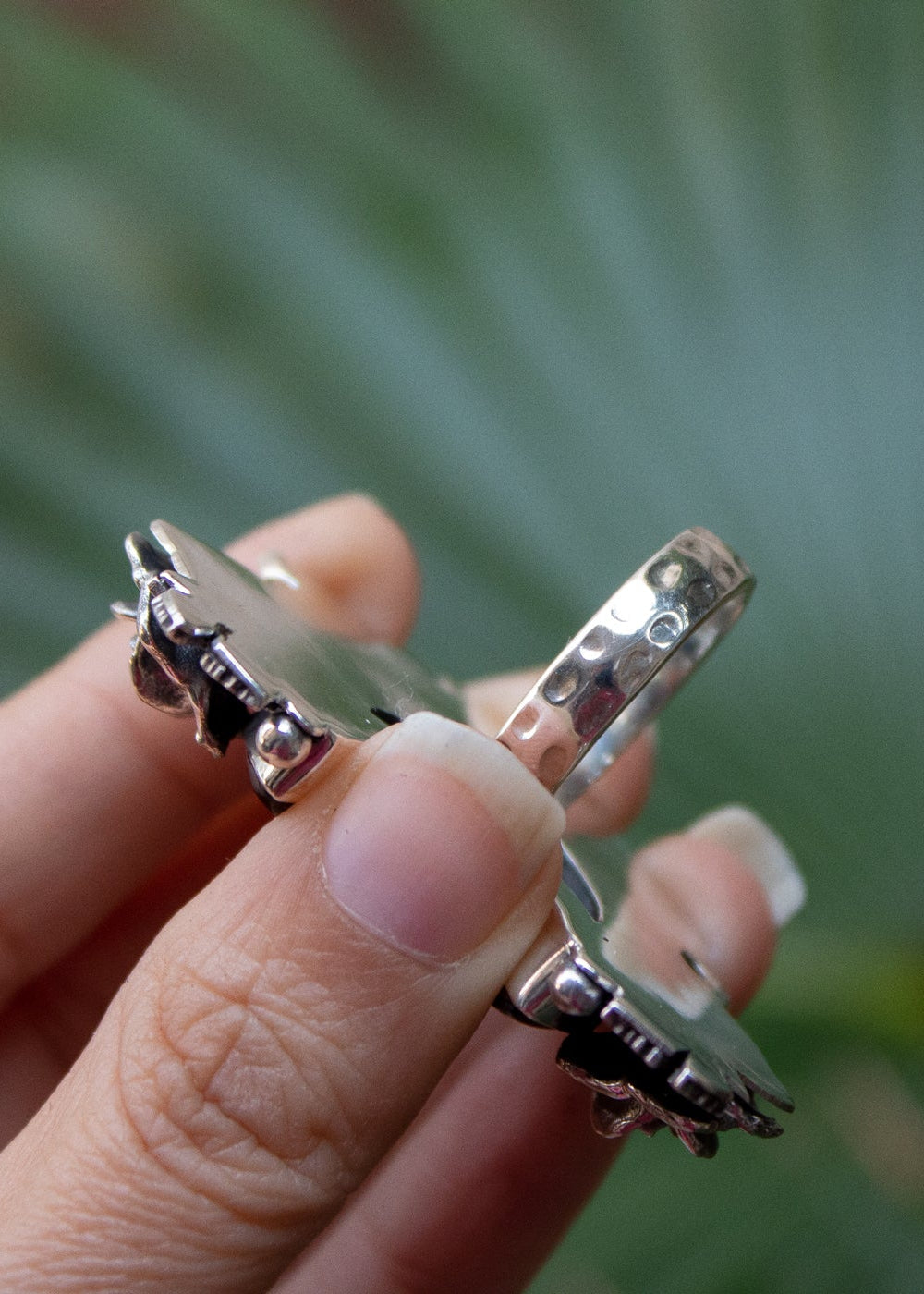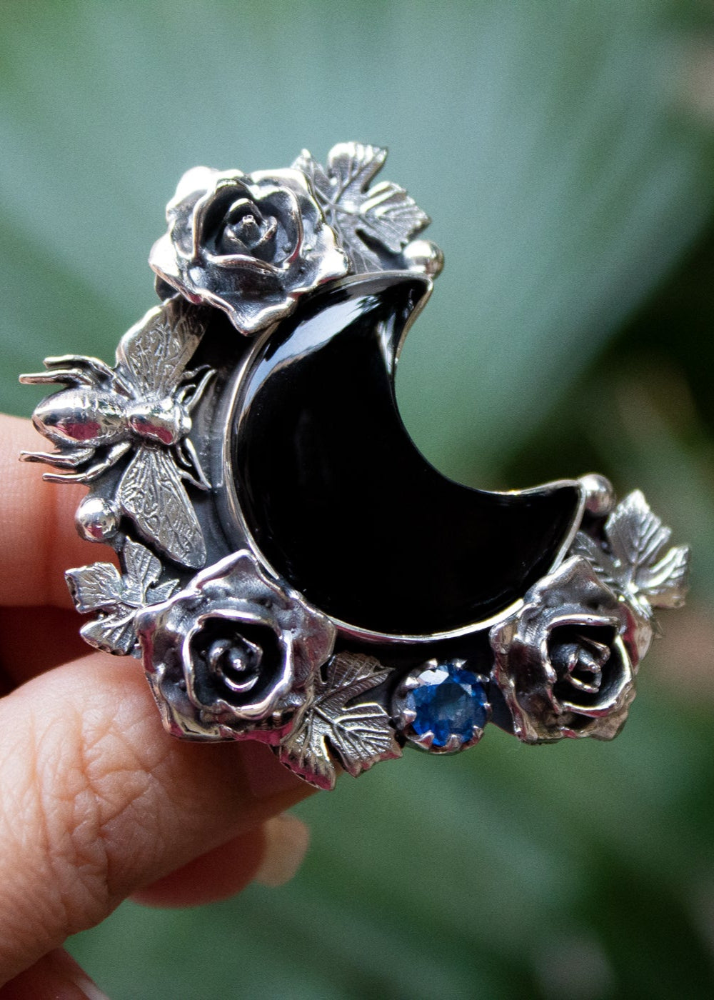 A bold crescent of polished black onyx rests at the heart of this sterling silver ring,