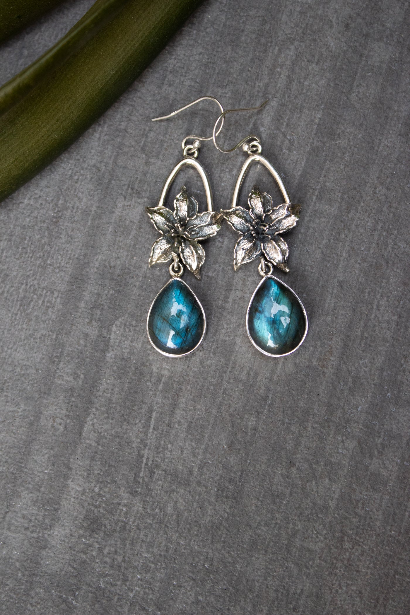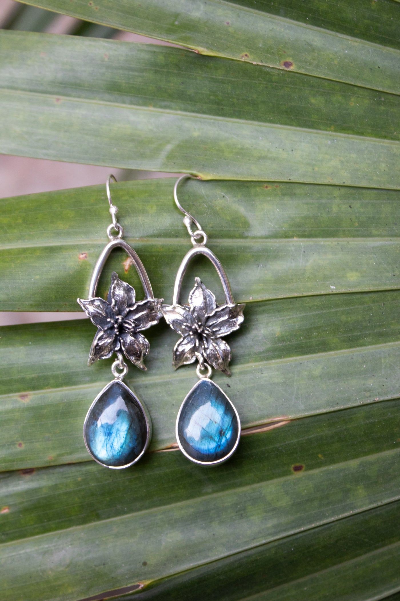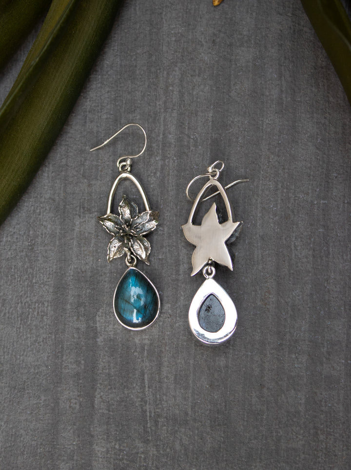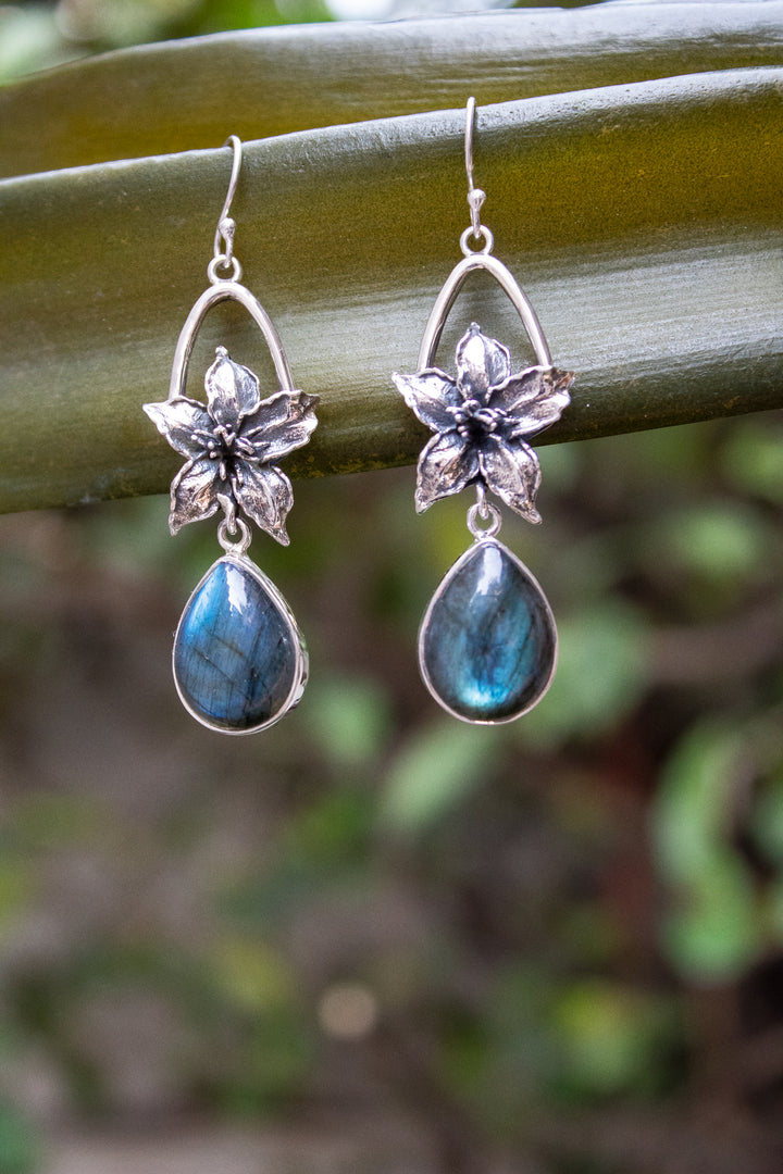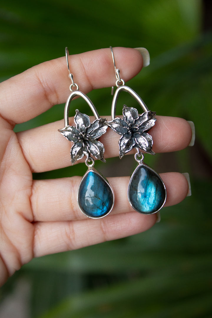 A pair of teardrop labradorite gemstones shimmer with flashes of blue fire, embraced by hand-carved sterling silver flowers. These earrings hold the mystery of the night sky—perfect for dreamers and seekers of hidden truths.