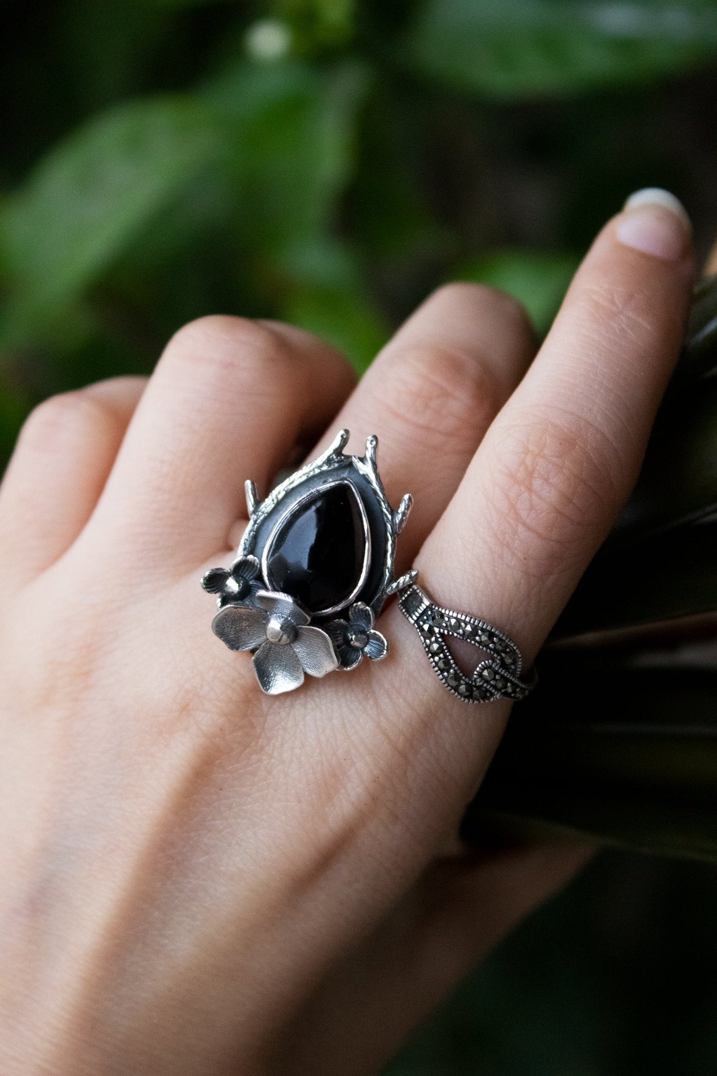 A striking teardrop onyx, set in a sterling silver floral frame, blooms from branches of silver. Bold yet graceful, this ring radiates strength and grounding power—an anchor of stability wrapped in natural beauty.