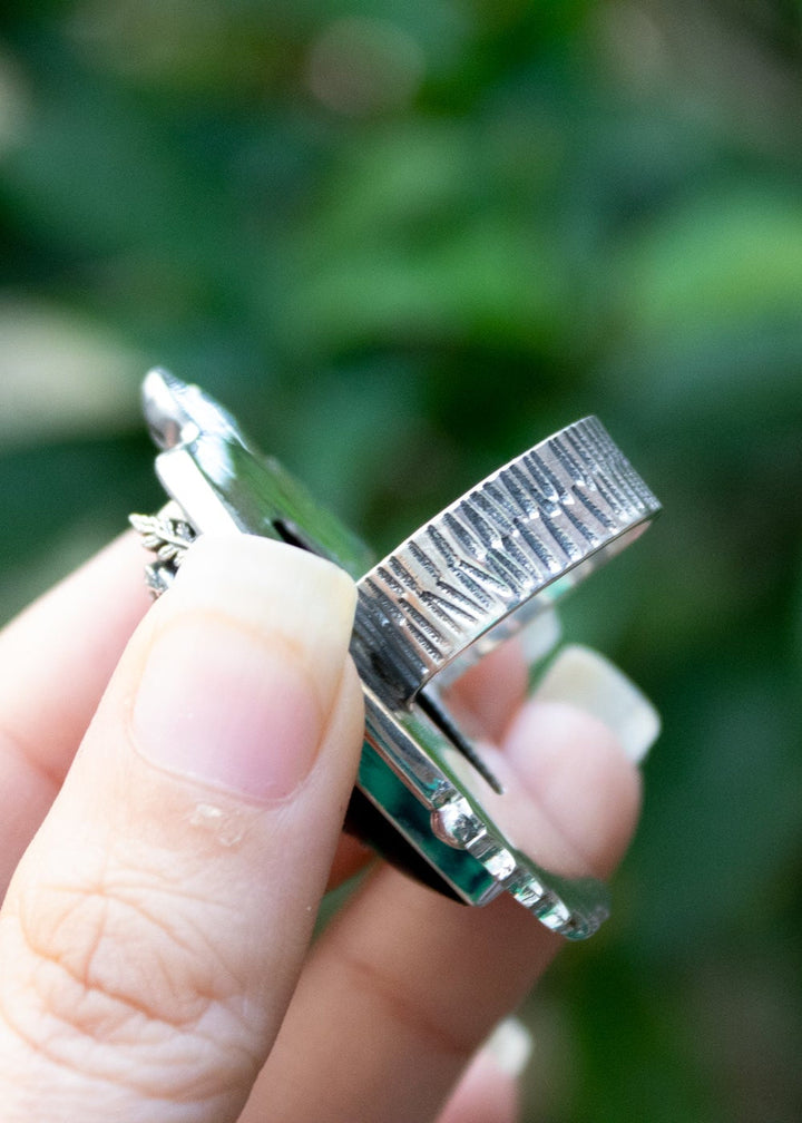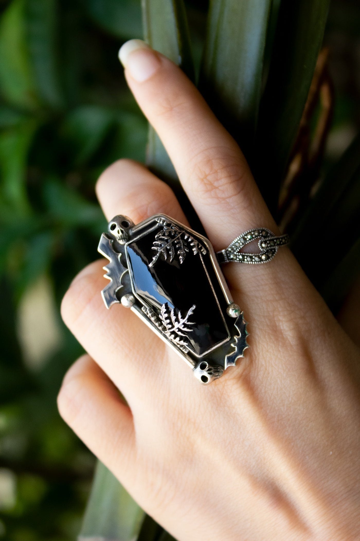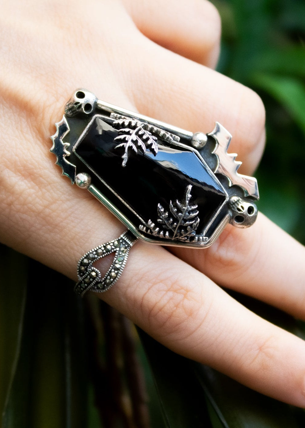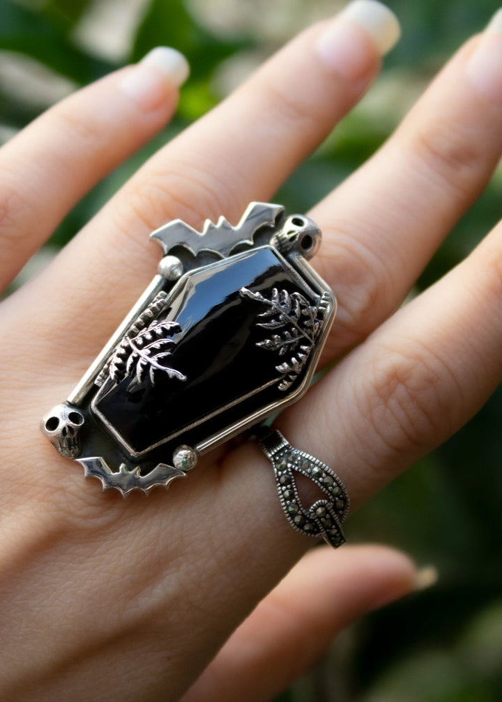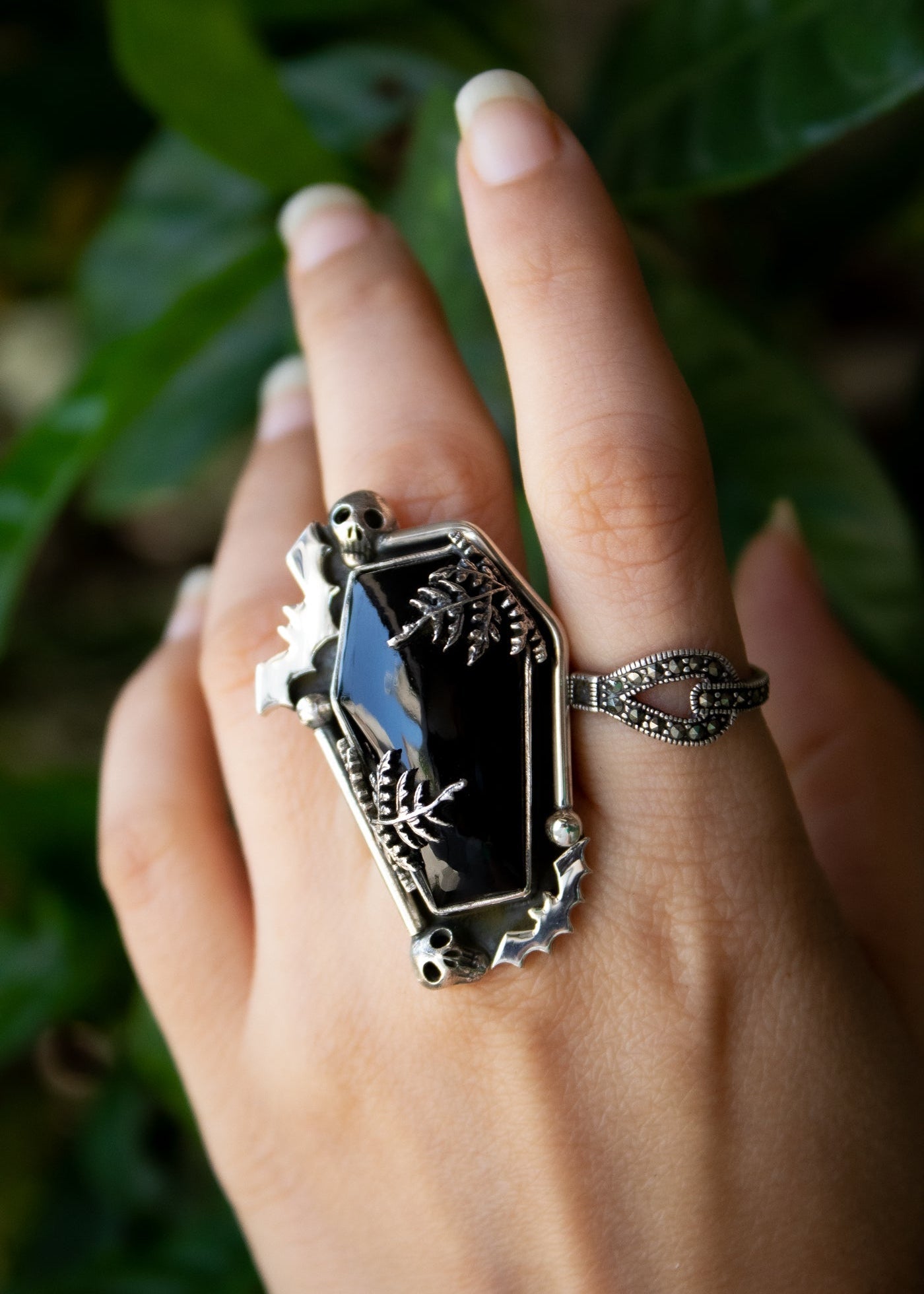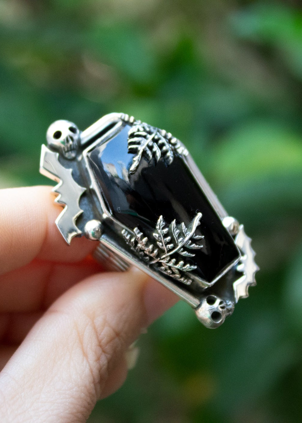 A striking Black Onyx coffin centerpiece framed in sterling silver with gothic details of skulls, bats, and leaves. This bold ring embodies mystery, resilience, and protection — a perfect talisman for those who find power in the shadows.