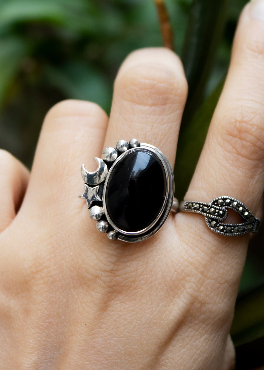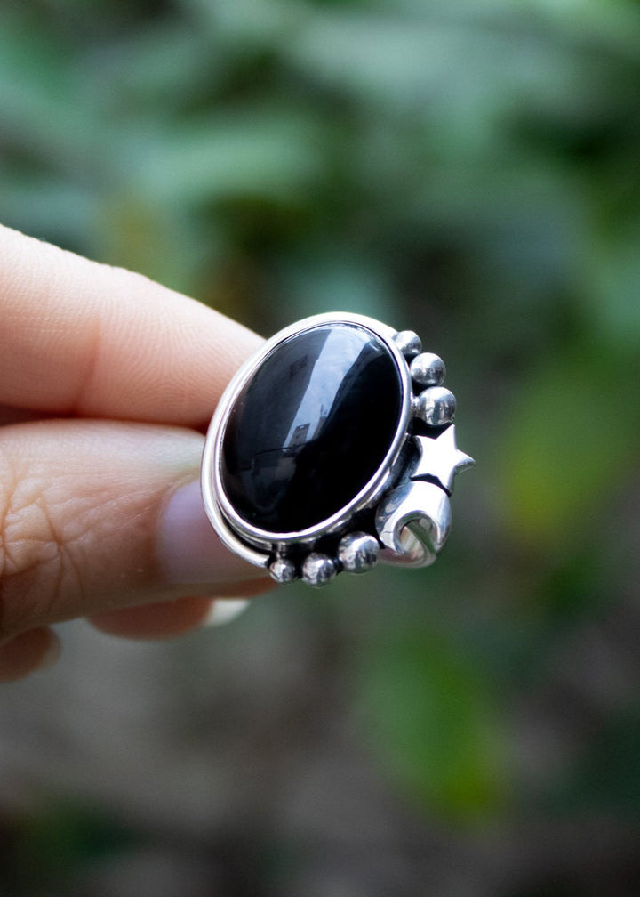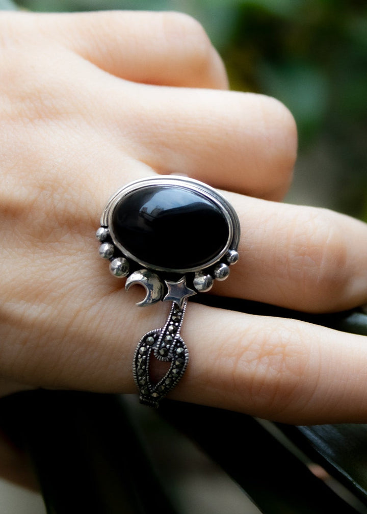 A deep black onyx glows under a sterling silver crescent moon and stars. This
