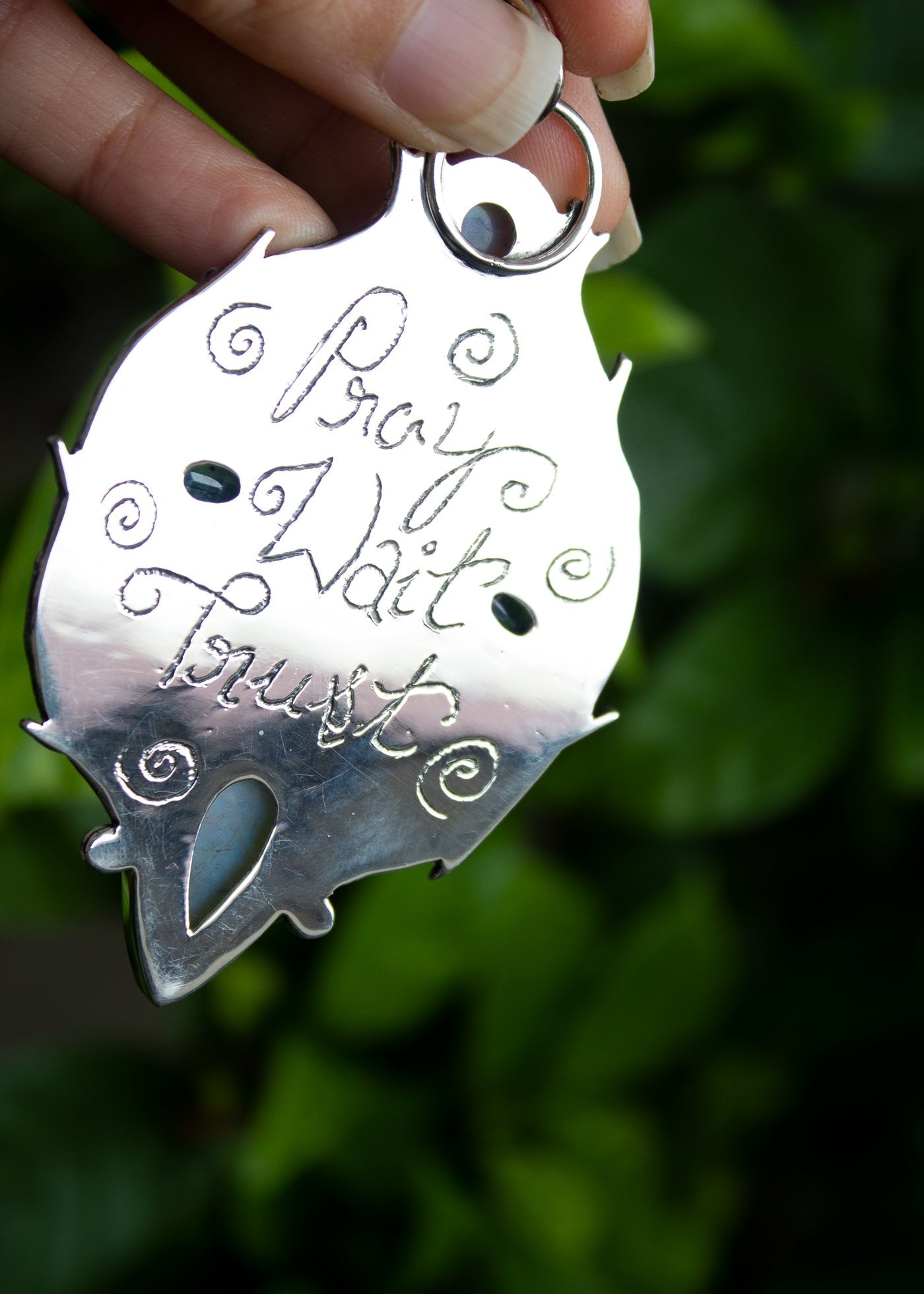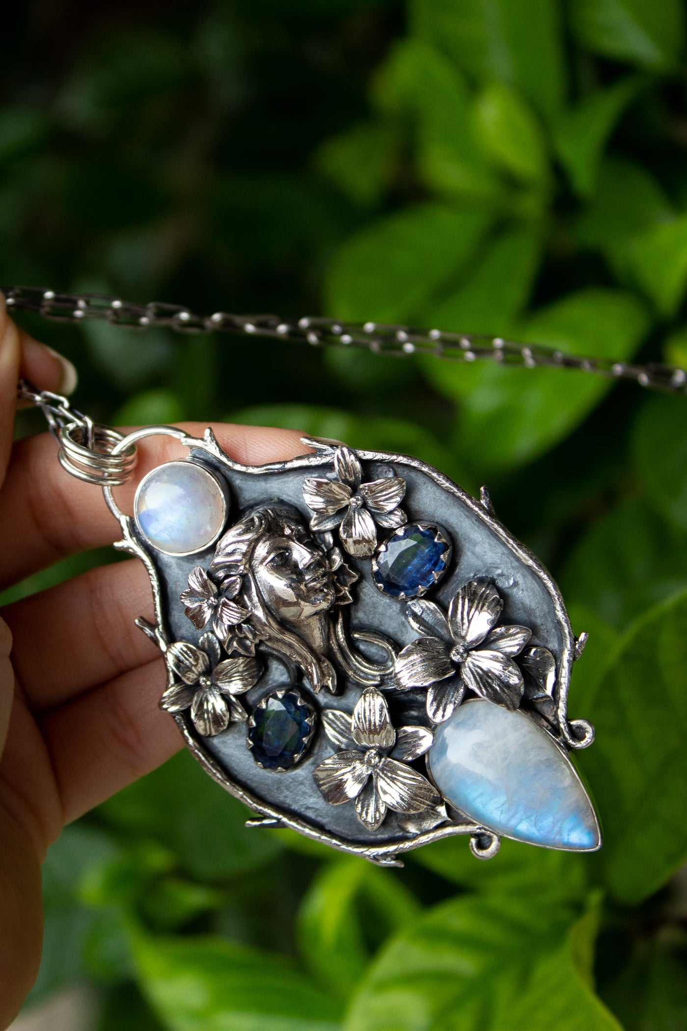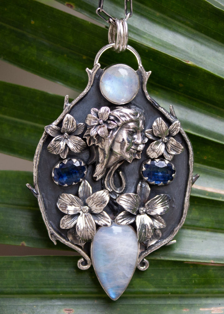 An enchanting pendant where a hand-carved muse is crowned with silver