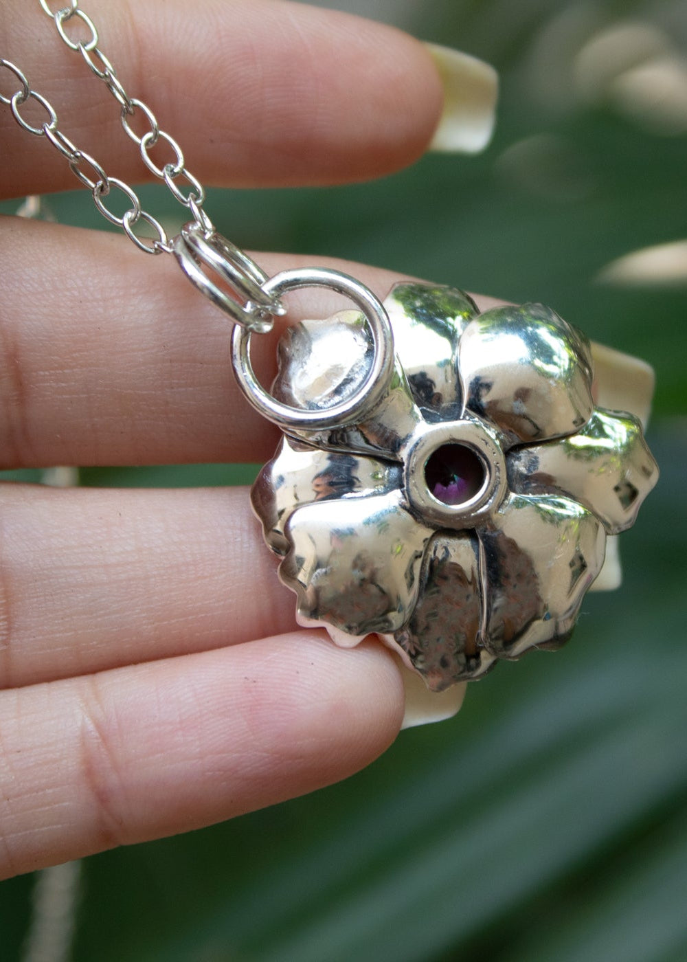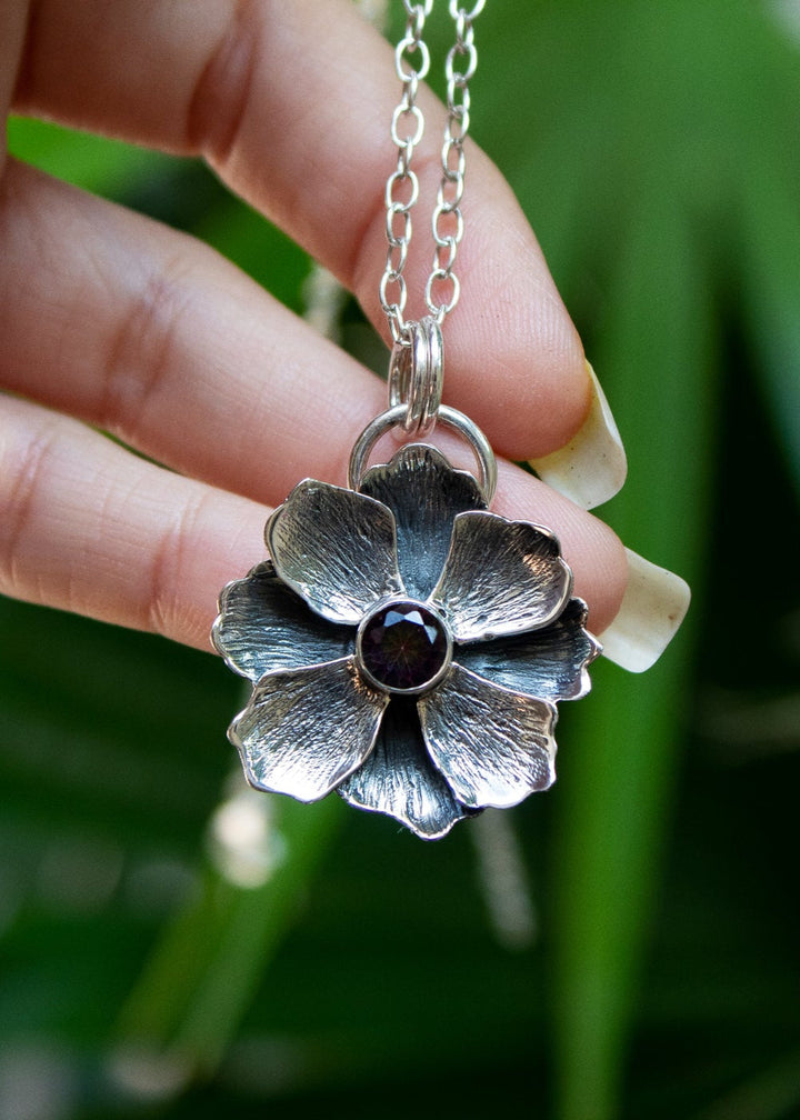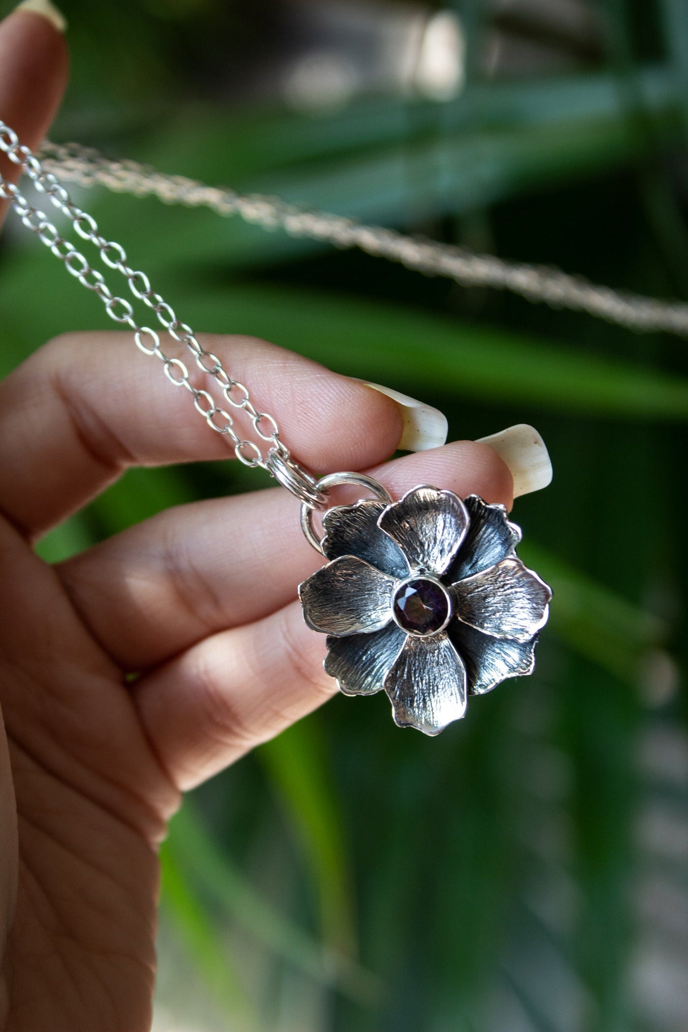 A sterling silver flower blooms in full detail, its petals textured with lifelike veins. At