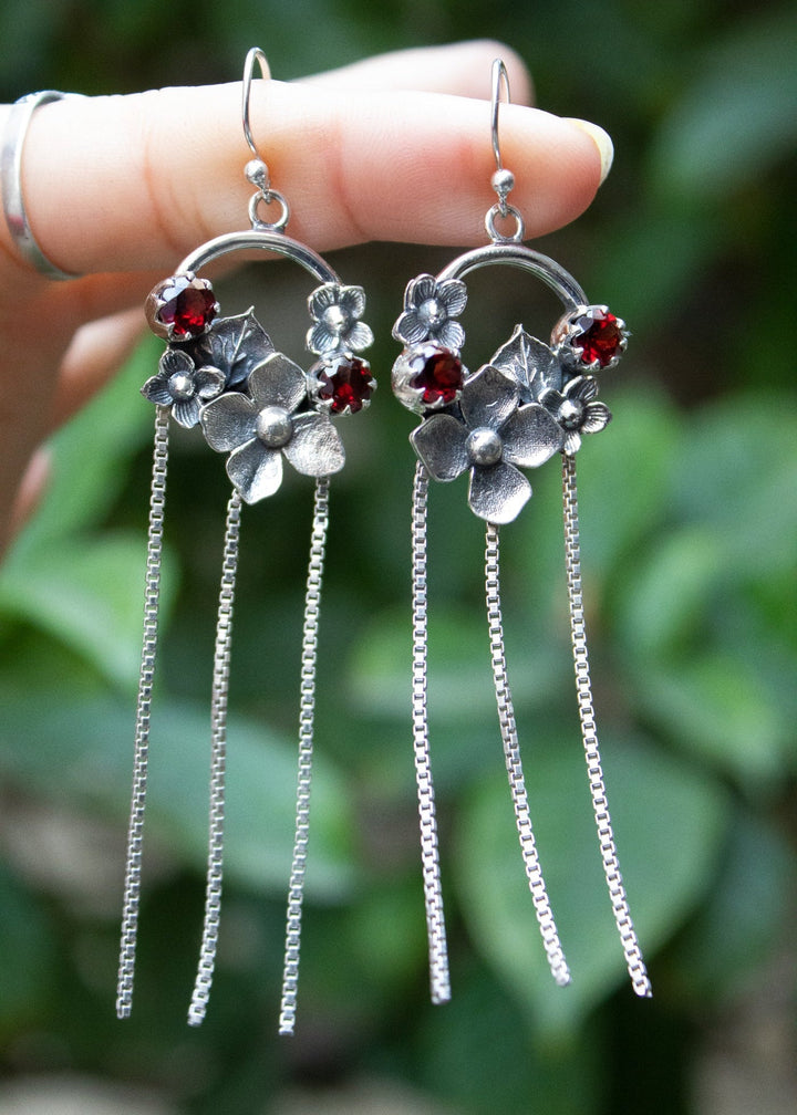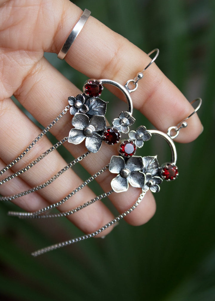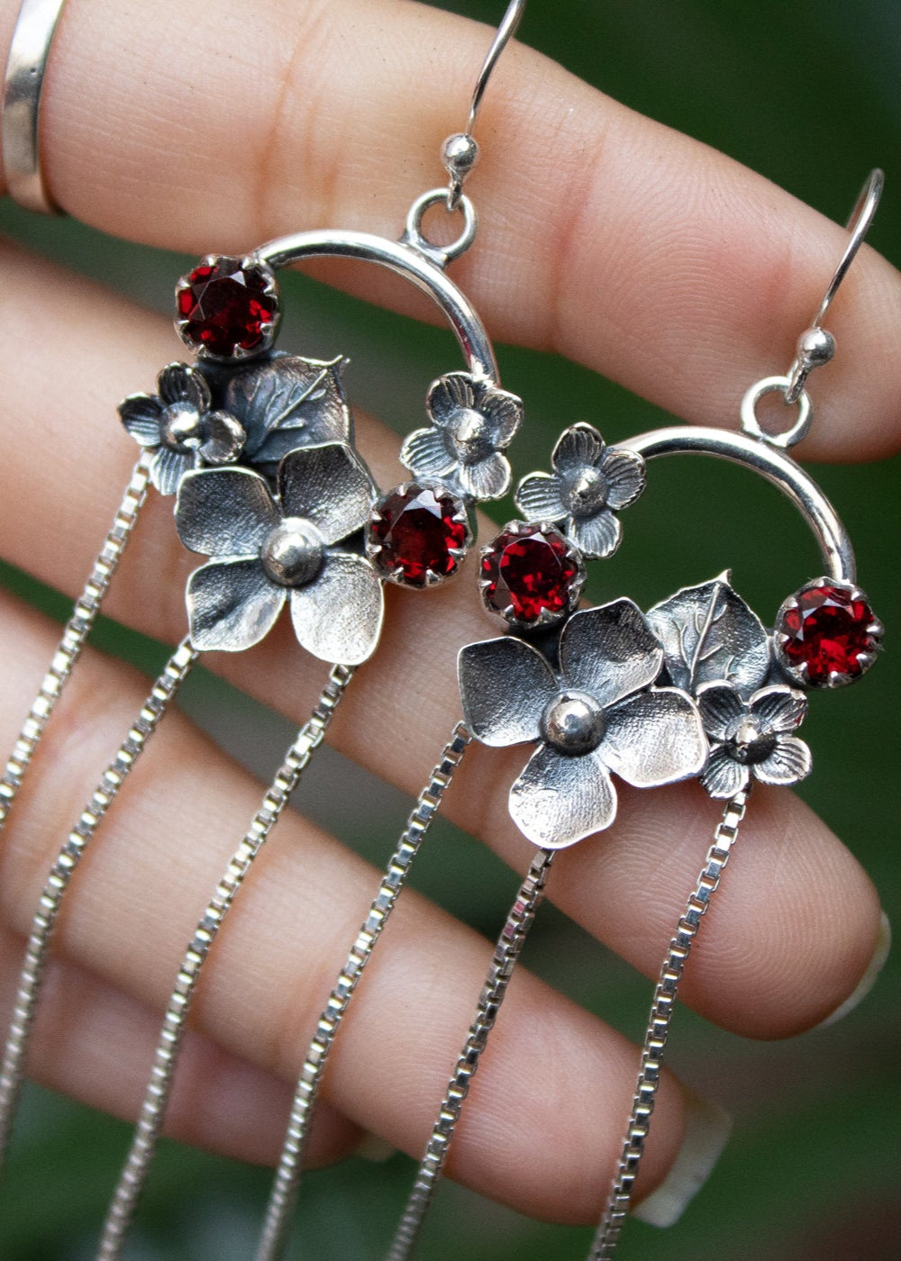 A symphony of garnet gemstones glistens among delicately sculpted sterling silver
