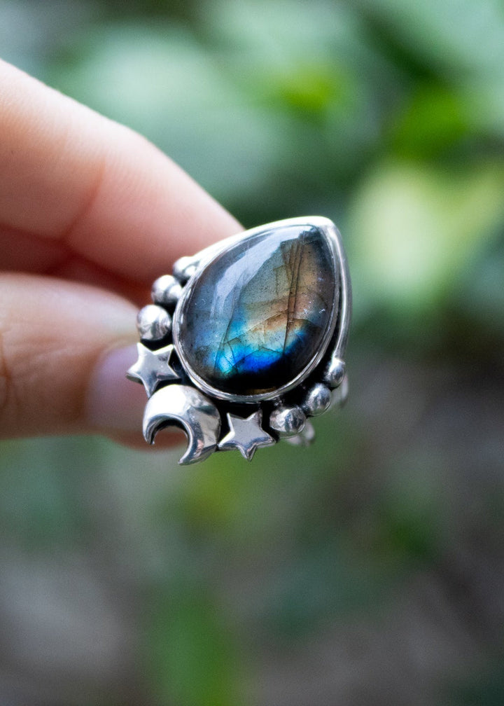 A glowing labradorite shimmers like a midnight sky, framed by silver moons and