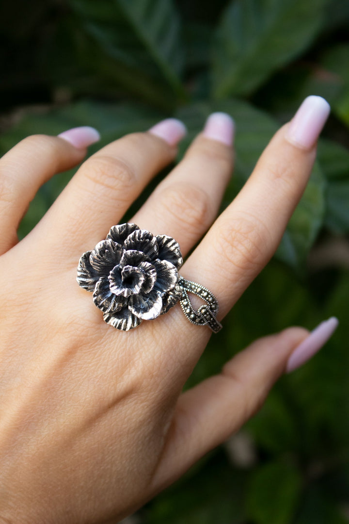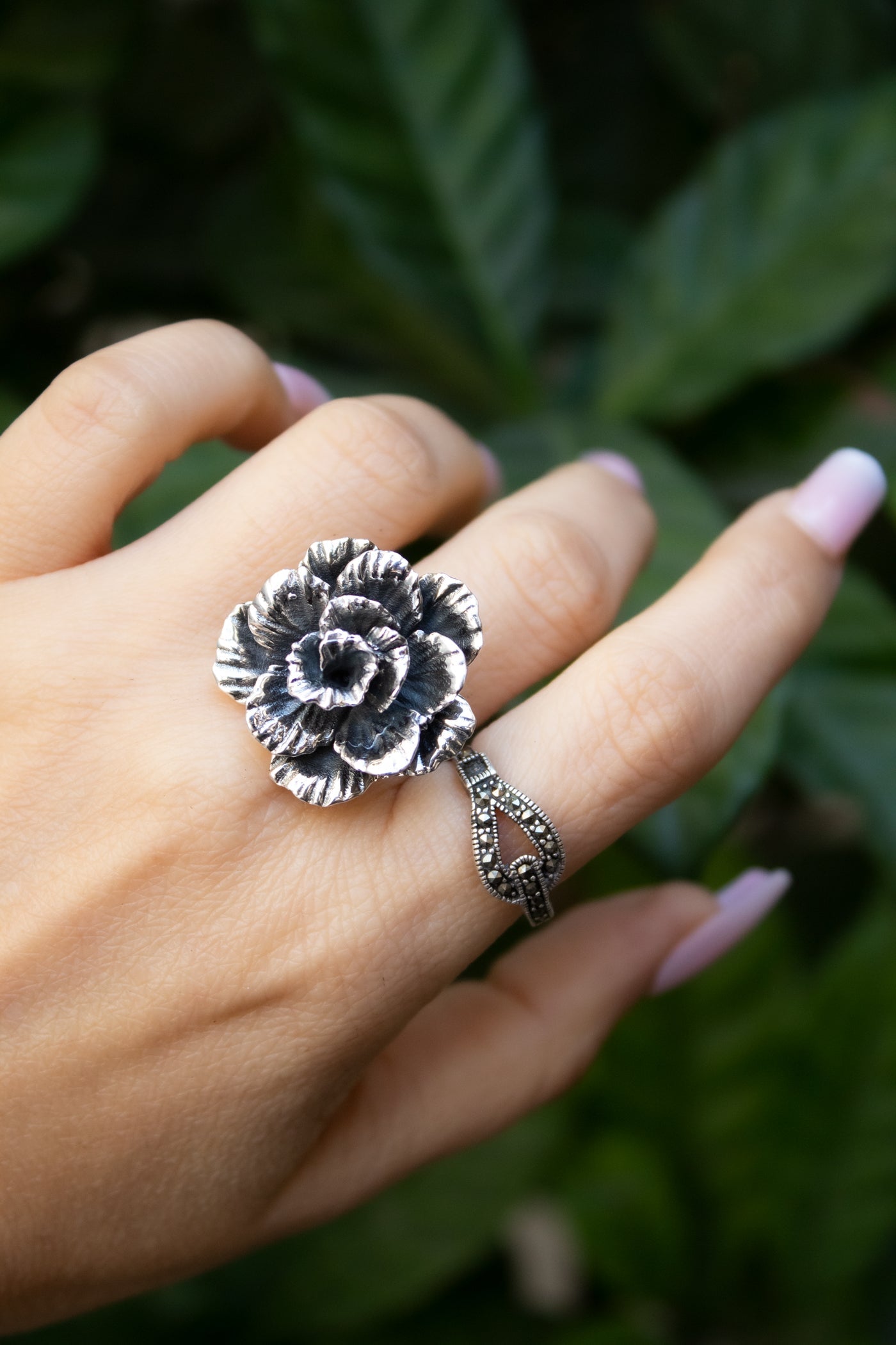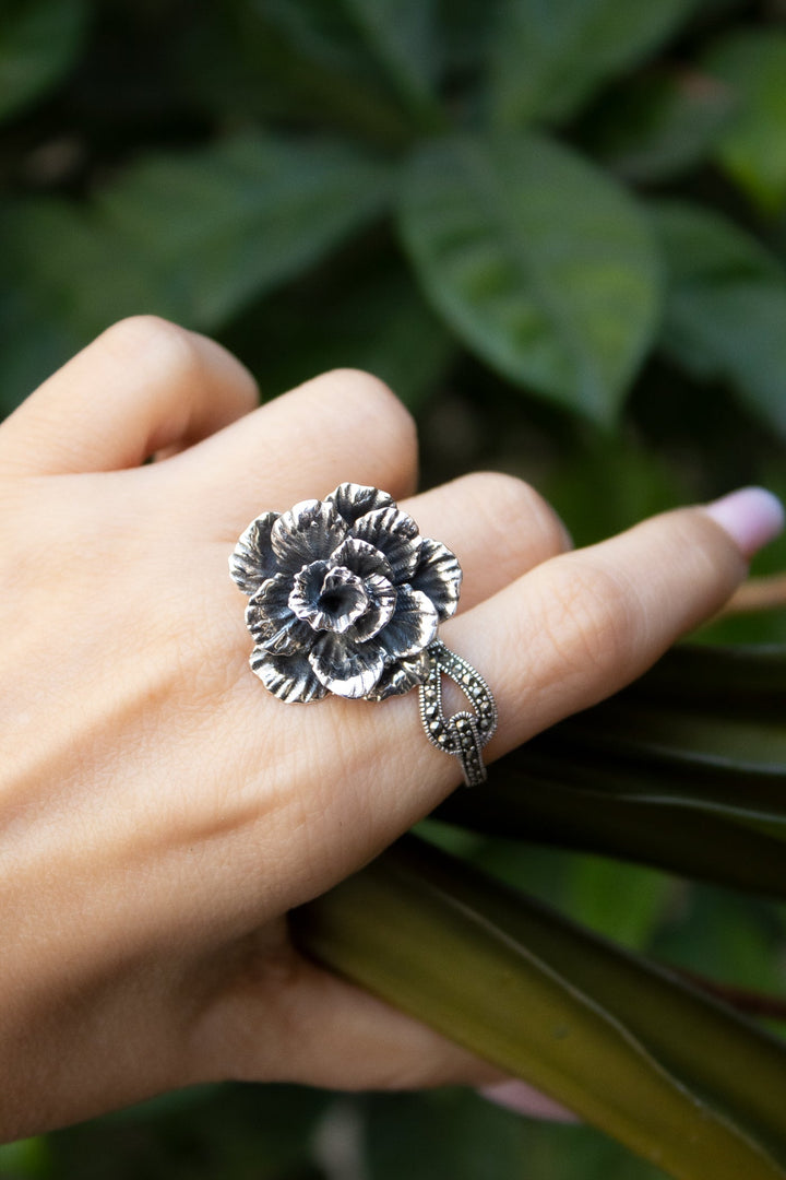 A bold and sculpted sterling silver carnation blooms in full detail, symbolizing