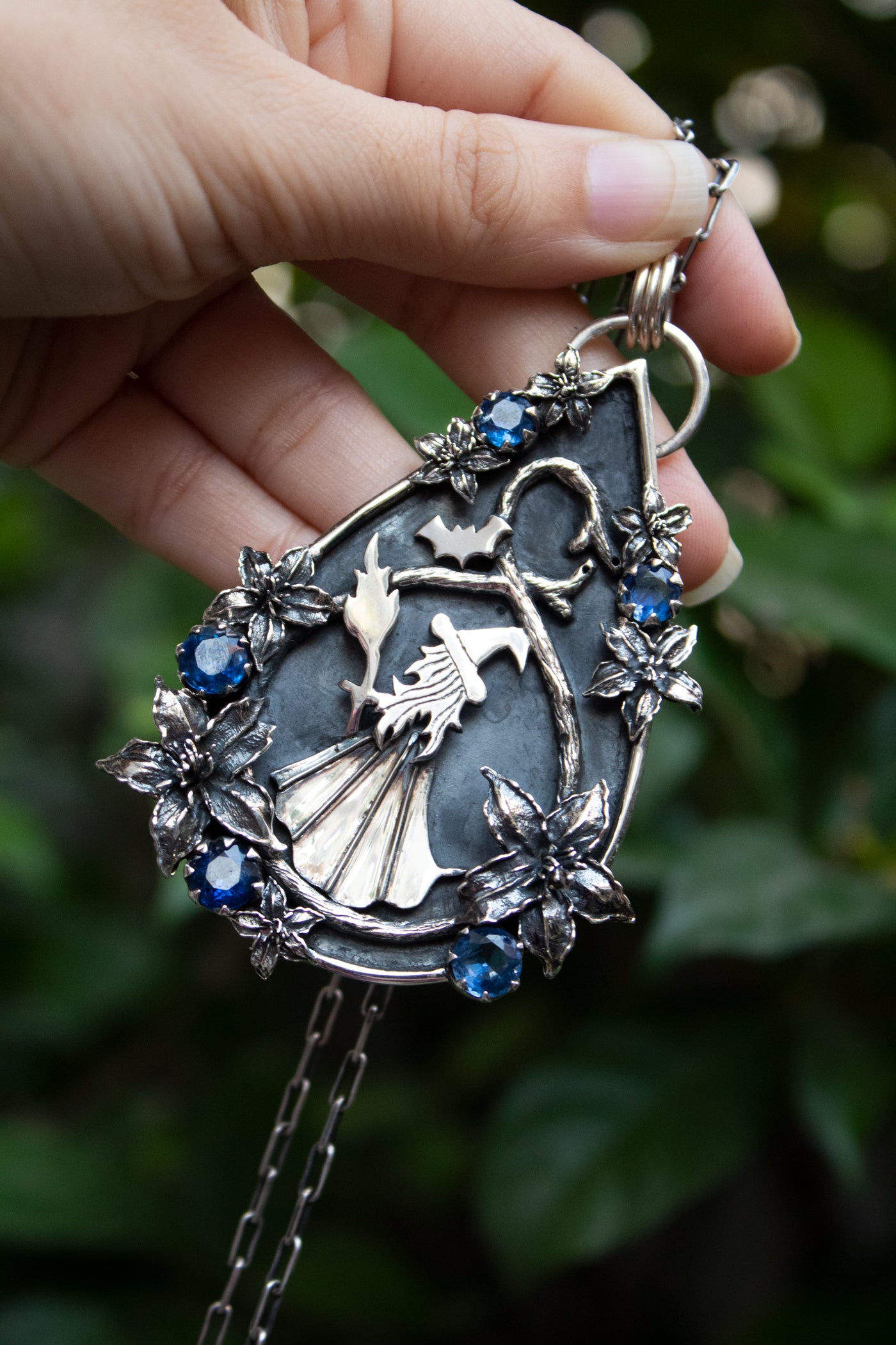 A handcrafted sterling silver pendant featuring a witch silhouette beneath a crescent moon, surrounded by blooming flowers and deep blue gemstones. Symbolizing wisdom, intuition, and protection, this statement piece blends celestial charm with mystical artistry—perfect for those drawn to the magic of the night.