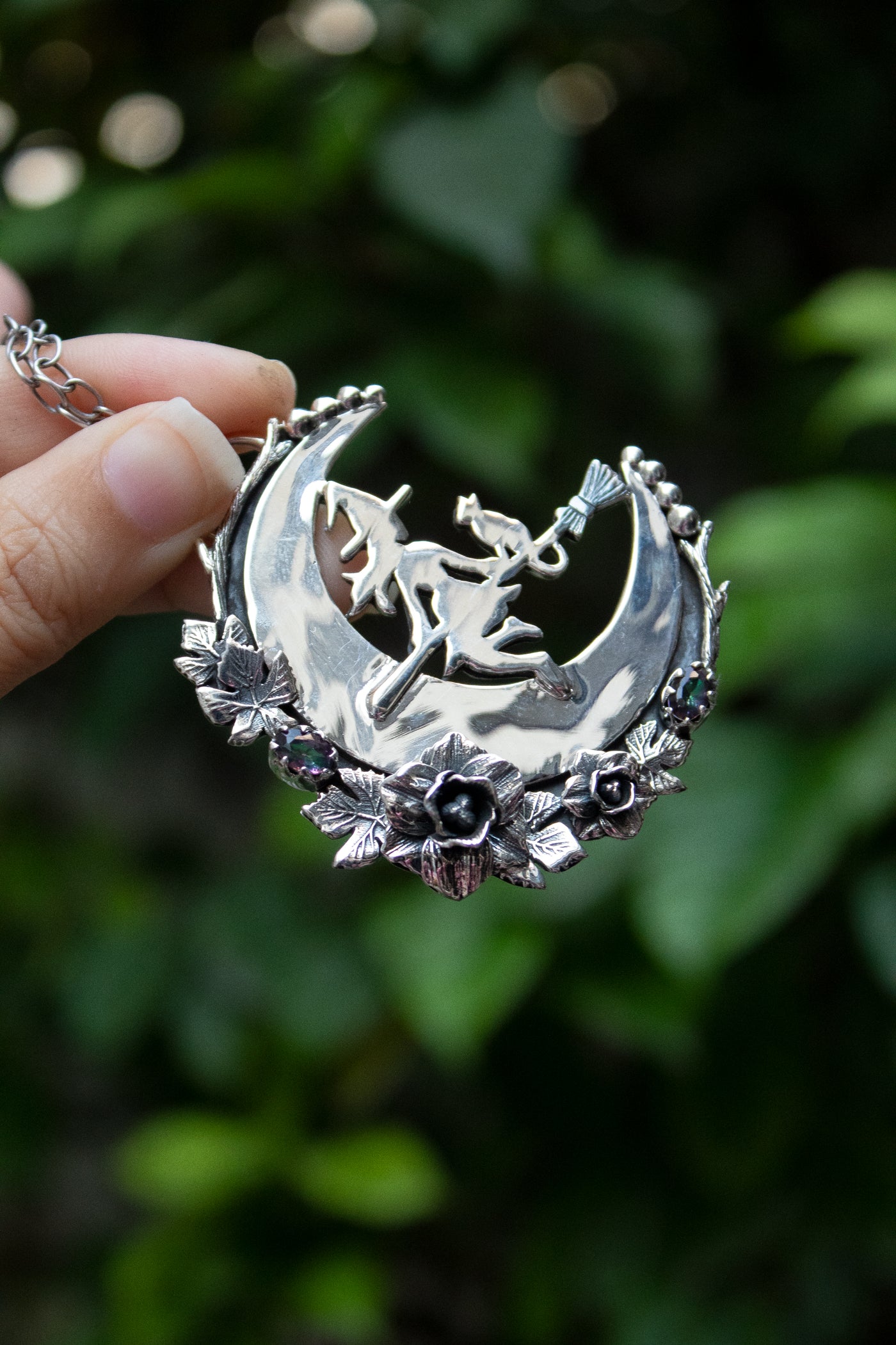 Handcrafted in pure sterling silver, this pendant depicts a witch soaring across a crescent moon, surrounded by detailed flowers and shimmering mystic topaz accents. A symbol of magic, mystery, and feminine power, it captures the spirit of the night sky—bold, free, and beautifully untamed.