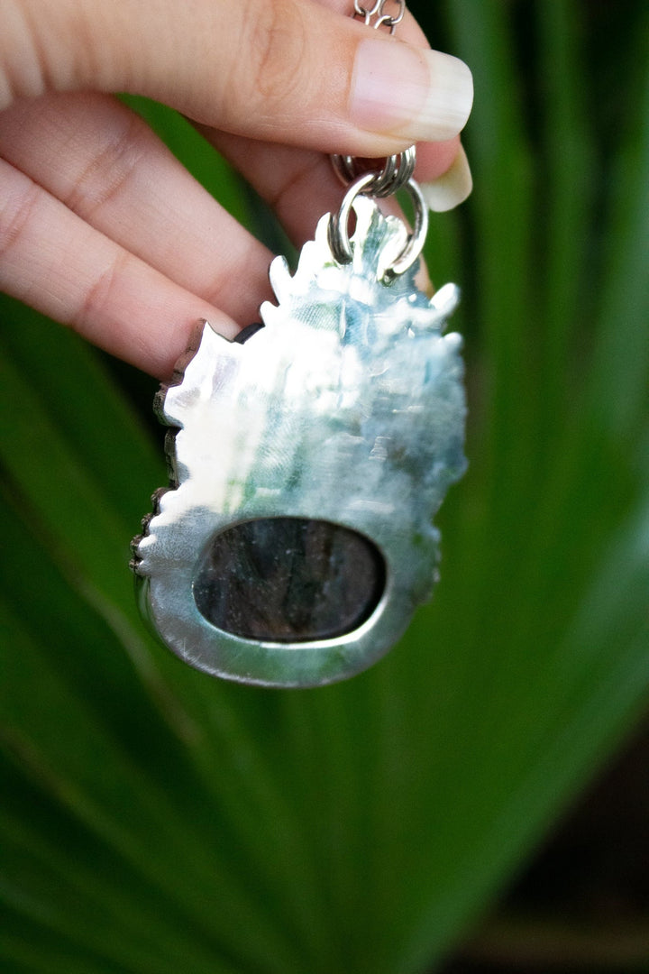 A powerful statement pendant featuring a glowing oval labradorite, its surface alive